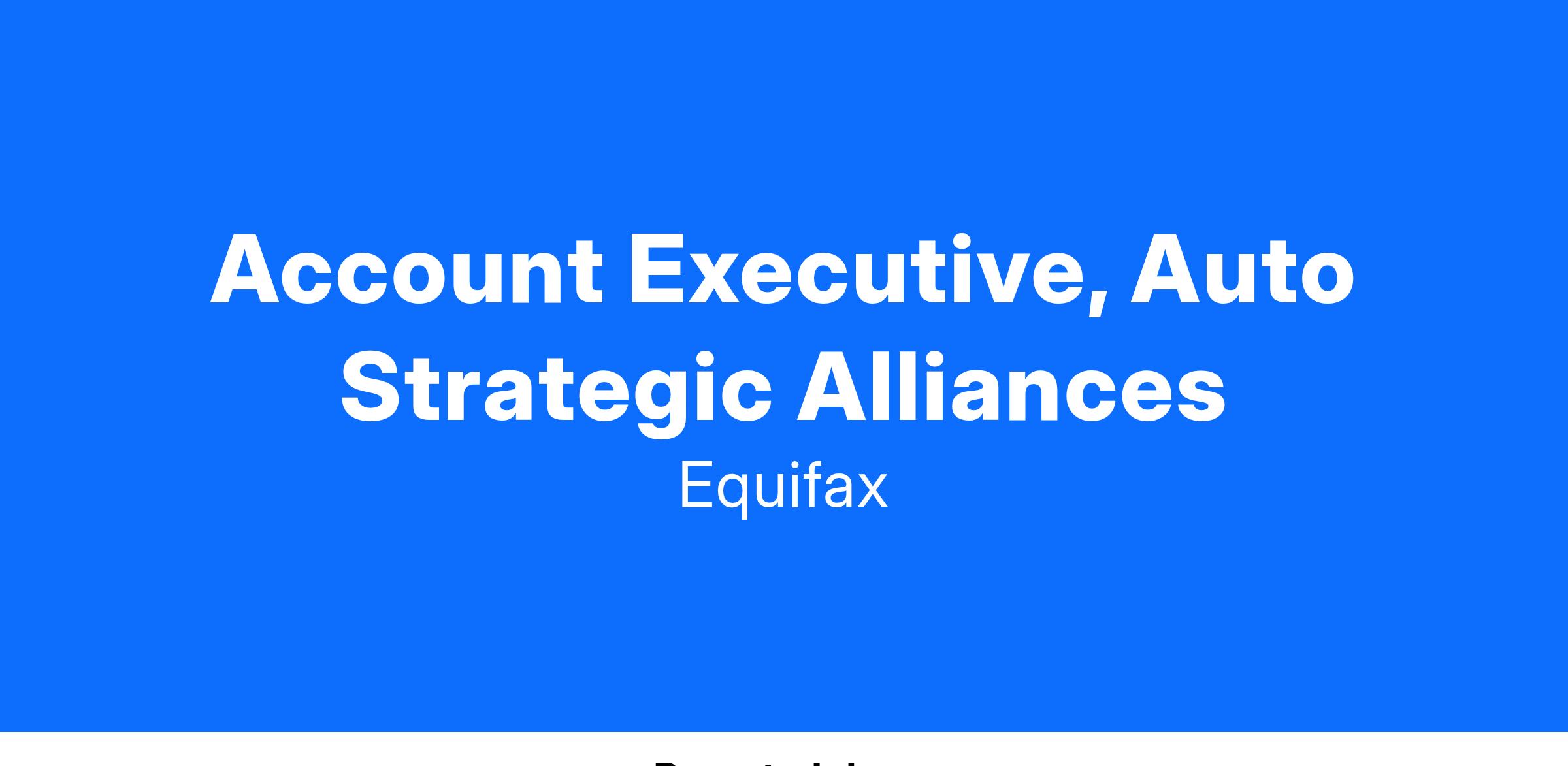 The Account Executive is a client-facing, sales role responsible for revenue generation, partner relationship and Equifax engagement within Auto Strategic Alliance accounts. The Account Executive must orchestrate other company resources efficiently to drive sales and revenue growth of a full Equifax solutions portfolio.