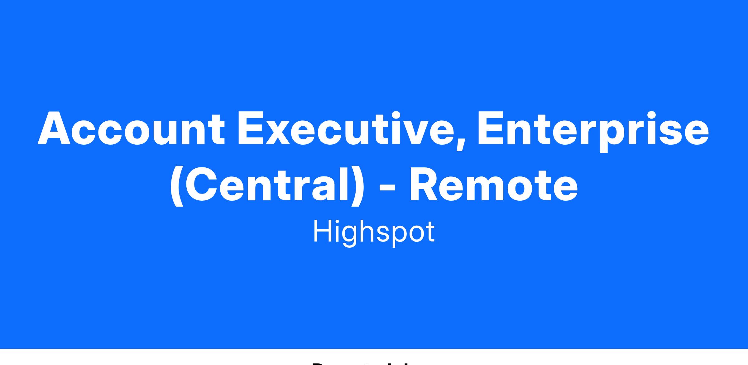 We are looking for an experienced Account Executive (AE) for our Enterprise business. The AE will develop, manage and close sales opportunities. The AE will have the opportunity to overachieve and earn uncapped commissions with accelerators based on performance. The AE must meet or exceed sales targets, manage deals, forecast accurately, and manage evaluation projects with customers and the Highspot team. The AE has experience selling to Sales and Marketing organizations. As a key member of our sales team, the AE must thrive in an environment that is highly collaborative and ever-evolving.