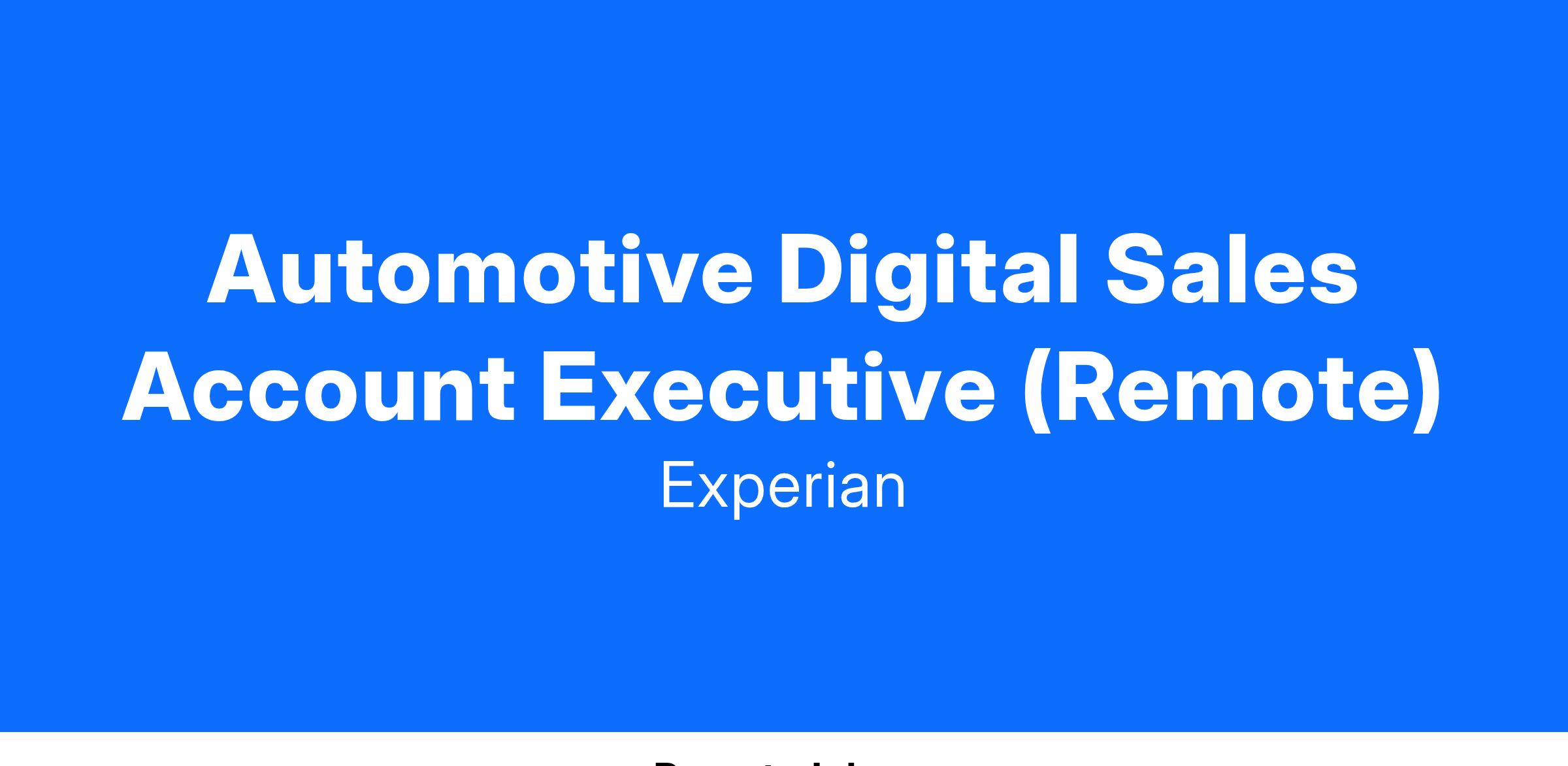 If you are a seller who loves the excitement of working for an industry leader that continues to evolve, you've found your next role. We are looking for a seller who has a background in, digital marketing and data sales. The Account Executive position at Experian Automotive will work across lines of Dealer Agencies, Marketing Tech, CDPs and more. You will grow existing lines of businesses and uncover new opportunities with new clients.