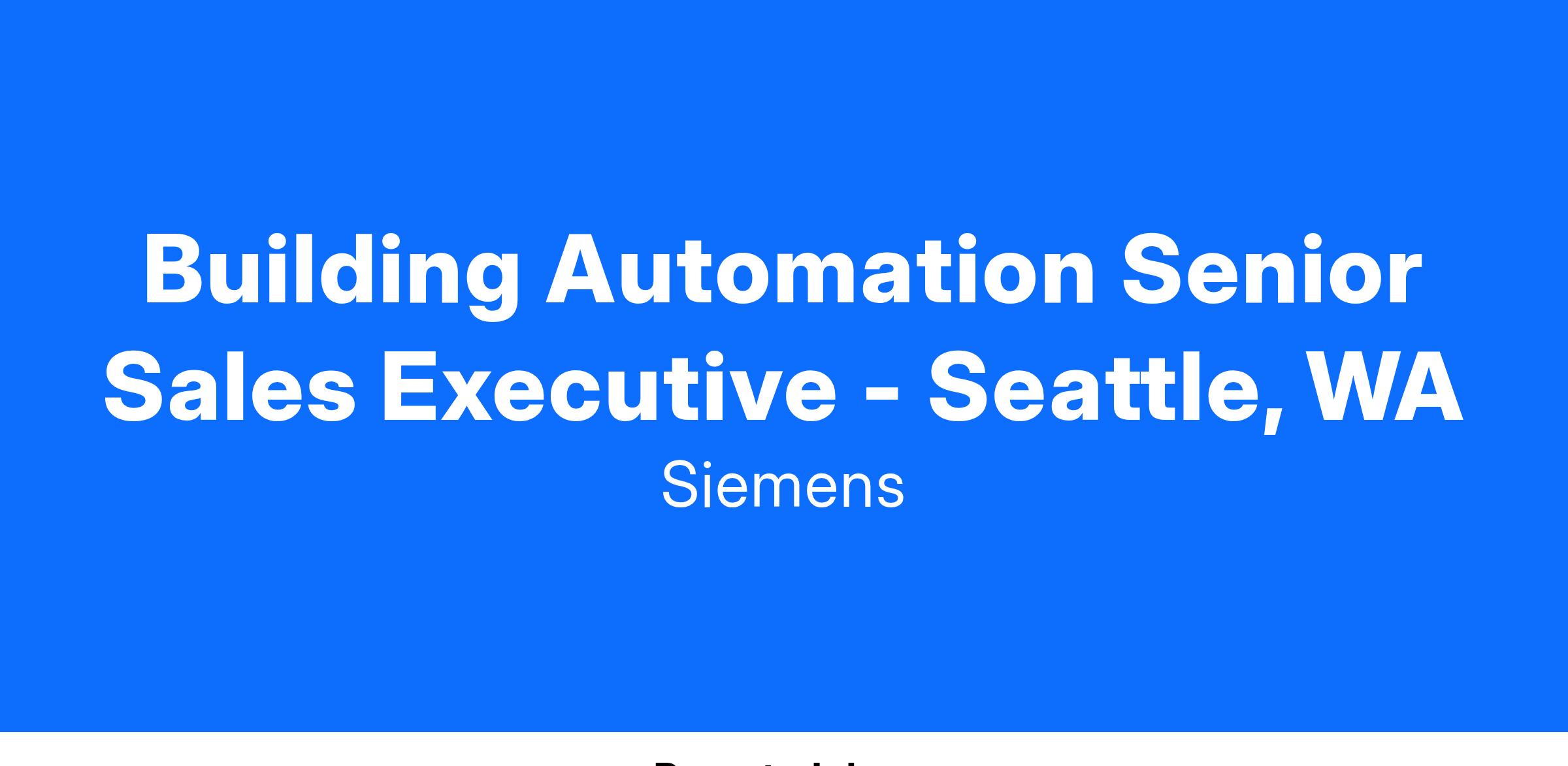 The Building Automation Sales Executive is a technical sales professional that is key to growing the Electrical Services business in the Seattle, WA area in vertical markets such as Healthcare, Corporate Real Estate, Data Centers, K-12, Universities, Federal and State facilities. Why is this so important? Our Sales Executives are ambassadors of quality Siemens technology, products and services, and your technical and financial expertise, along with critical thinking and negotiation skills, will help tailor our customer’s needs into winning solutions, for the direct end-user service market.