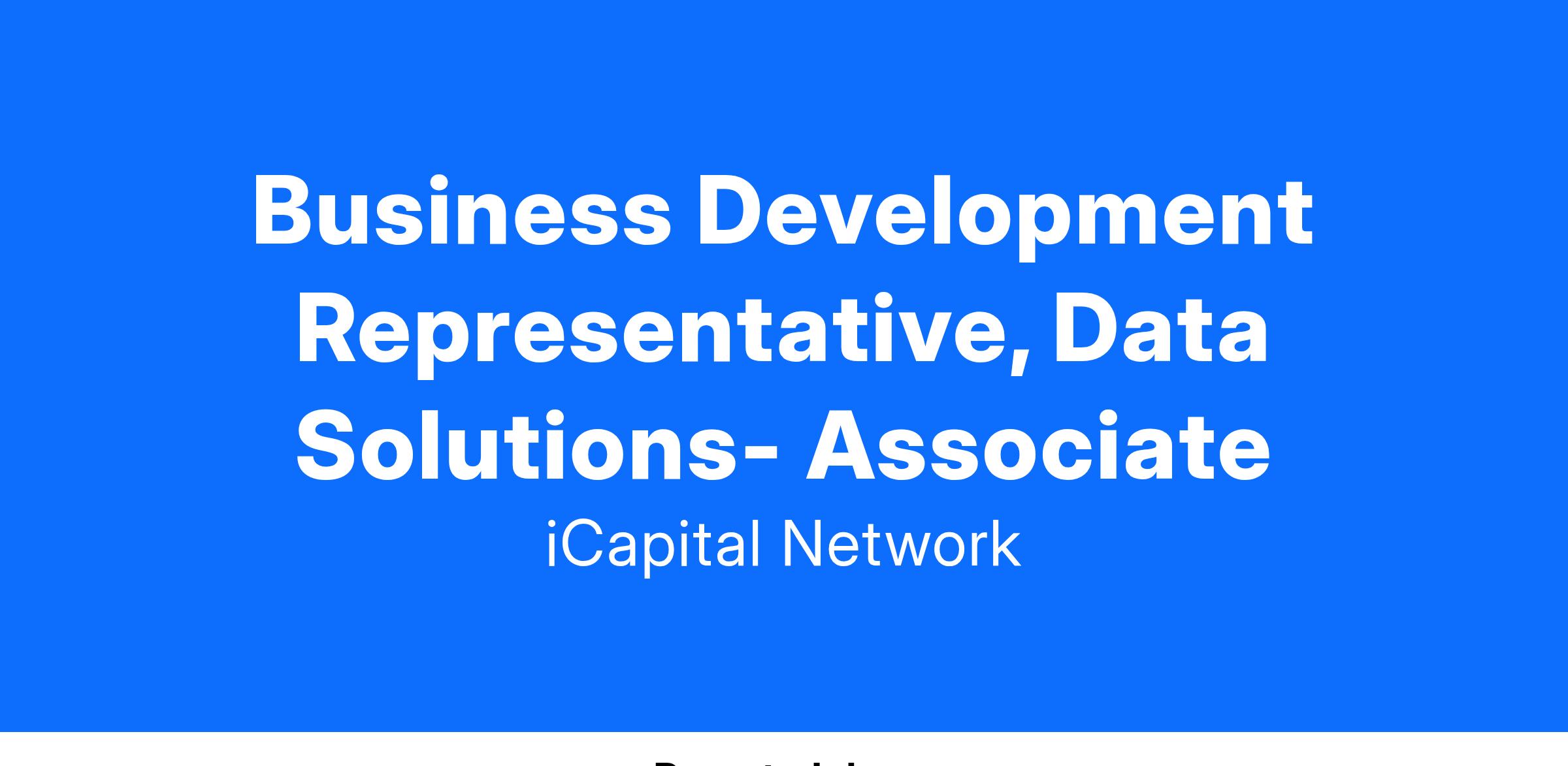 The base salary range for this role is $65,000 to $75,000. iCapital offers a compensation package which includes salary, equity for all full-time employees, this role is eligible for comisssion. Employees also receive a comprehensive benefits package that includes an employer matched retirement plan, generously subsidized healthcare with 100% employer paid dental, vision, telemedicine, and virtual mental health counseling, parental leave, and unlimited paid time off (PTO).