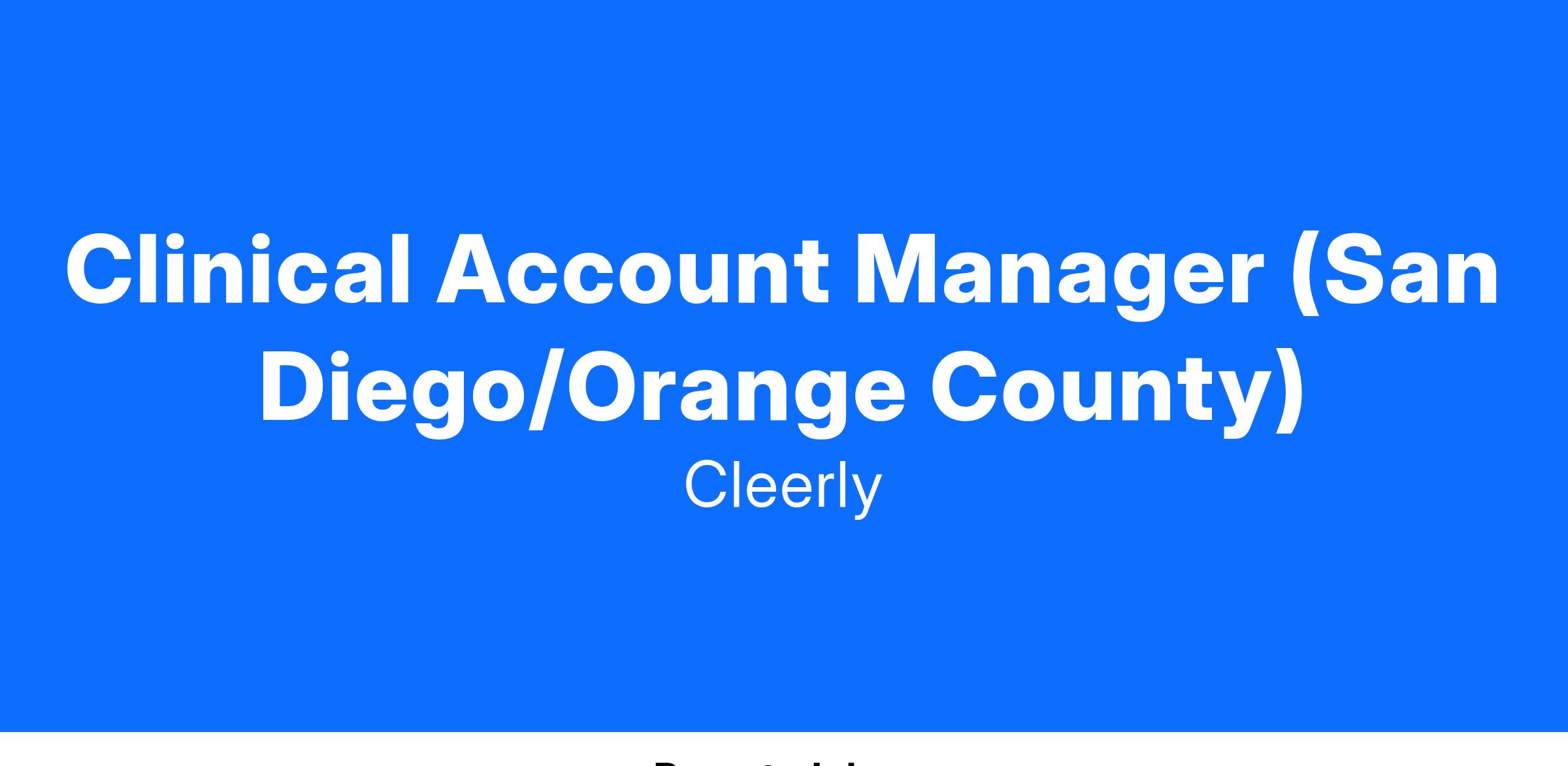 You will be responsible for identifying growth opportunities, maintaining relationships with existing high-value partners, and representing Cleerly as a leader in the industry to positively impact the lives of millions. The ideal candidate is highly motivated, has a clinical background, is client focused, result-oriented, and mission-driven. You will work with clinics to ensure that they are extremely successful with Cleerly’s cardiovascular diagnostic technology by proactively supporting, educating, and providing high customer satisfaction. This is a customer- facing role with a primary focus on spending time with customers including Cardiologists. This is a remote role, but you must be based in or near San Diego, as it will be a key market in your assigned territory. This role will support several states and requires both car and air travel. The states it will support are: Palms Springs, Inland Empire, Orange County and San Diego.
