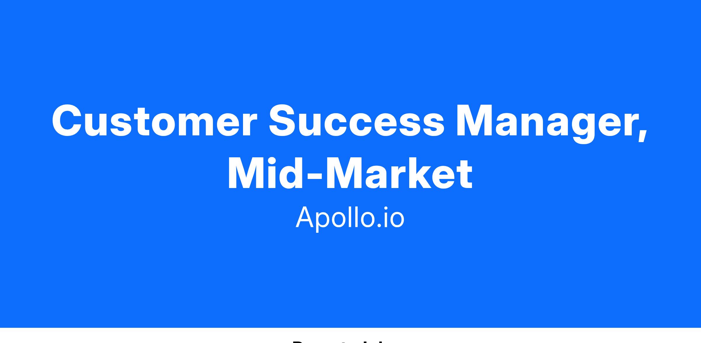 We’re looking for a passionate, data-driven High Touch Customer Success Manager who understands that Customer Success is a combination of relationship management, strategic expertise, and inter-departmental collaboration. Your book of business of ~80 accounts (ARR spend of $25k+ each) will include a combination of high touch accounts and key logos with high expansion and high product adoption potential. You’ll be focused on proactive communication, customer education, identifying risk early and often, and engaging with multiple personas on the customer side to drive incremental product line adoption. “White glove” style ownership of the customer experience, from partnering with our Onboarding team to escalation management with our Support and Product leadership, is critical to your success in this role. The High Touch CSM is expected to be proactive and consistent with 1:1 outreach to customers, team knowledge sharing, identifying upsell and cross-sell opportunities for our Account Management team, proactive customer health maintenance/risk mitigation, renewal facilitation with our AM team, customer advocate identification, maintenance of customer account records in CS Tooling (Apollo, Vitally, Intercom, Salesforce) and achieving adoption, NRR, and activity targets each fiscal quarter. At the end of each subscription term, customers should be able to articulate the ROI they’ve gotten from Apollo based on your outreach and ideas.