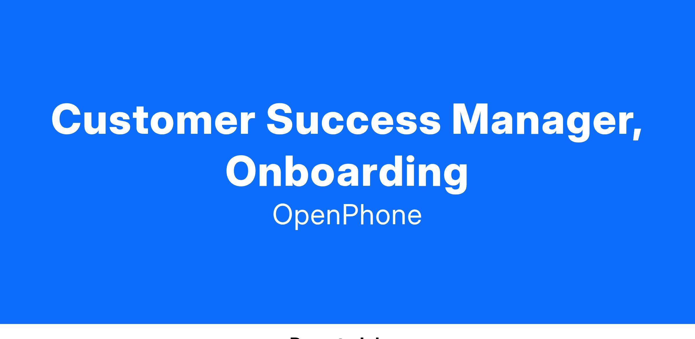 We're looking for a Customer Success Manager, Onboarding to help customers succeed by building and executing scalable onboarding strategies at OpenPhone. In this role, you'll engage with customers through both personalized interactions and automated, data-driven touch points to drive activation and adoption. You'll leverage customer insights to optimize the onboarding experience, ensuring a smooth transition and long-term success. If you're passionate about creating impactful onboarding programs and thrive in a fast-paced environment, we’d love to hear from you!