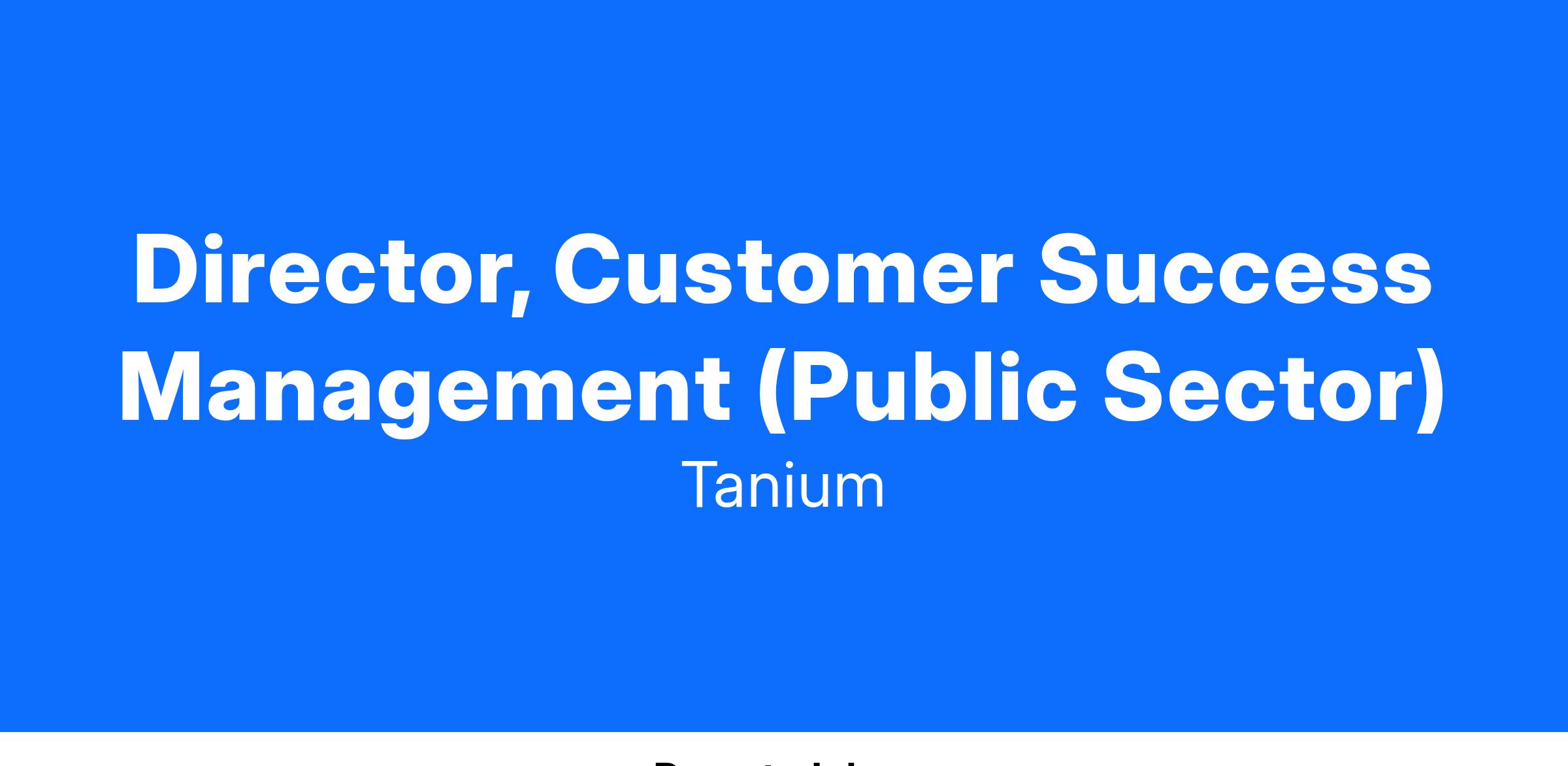 The Director, Customer Success Management role is critical to helping customers receive value from their investment in Tanium and to ensure Tanium maintains its enviable base of high value, loyal customers that rely on Tanium to manage all their endpoints. This customer facing role will be responsible for customers each having thousands of endpoints running the Tanium platform and solutions. The successful candidate will be able to manage a significant set of customers and use data and qualitative feedback to decide how best to engage resources to drive desired results.