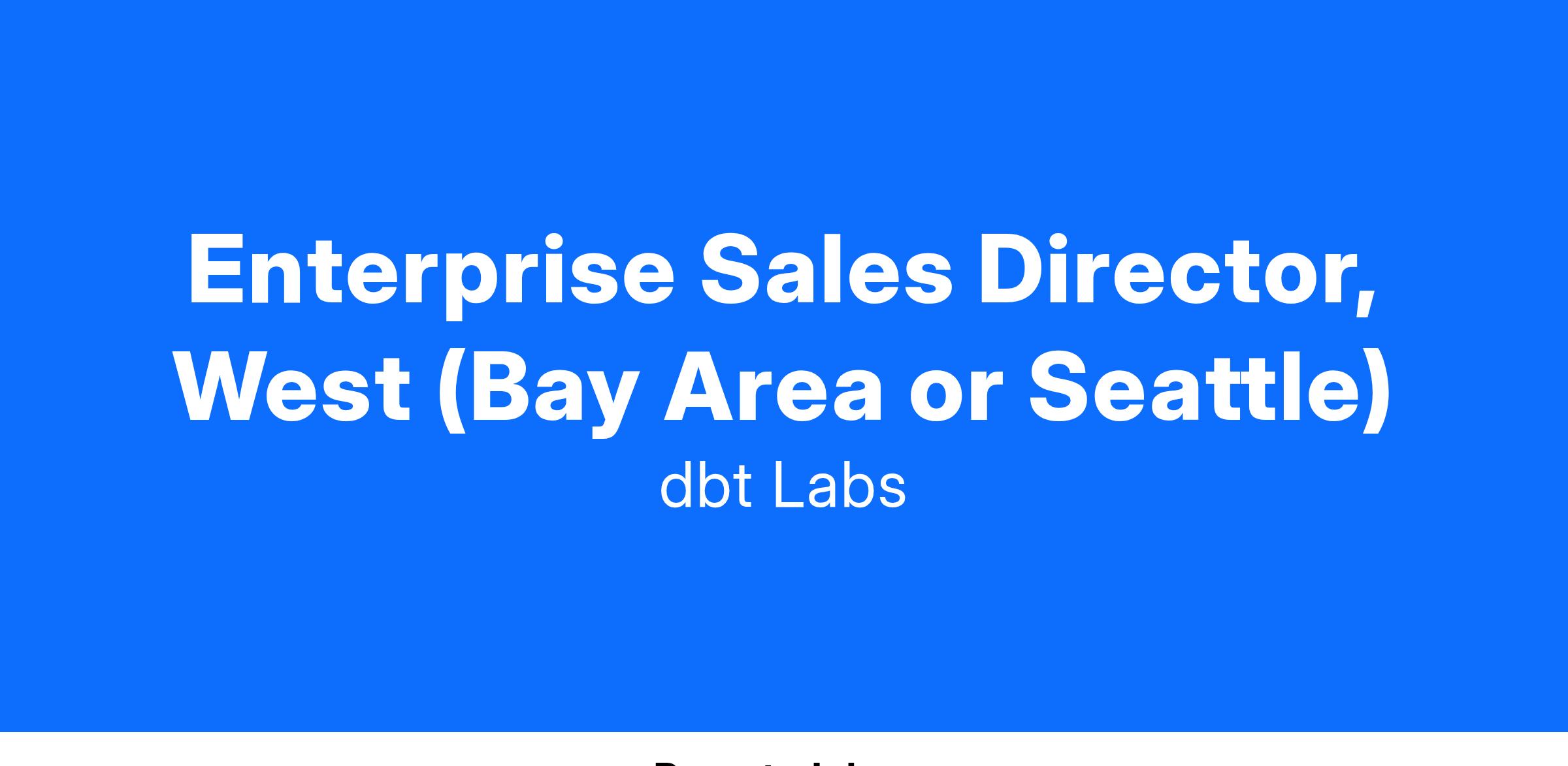 As a Sales Director, you will be responsible for managing our enterprise customer base. The ideal person will be a proactive and curious member of our growing Sales team, identifying new business with prospects and growth opportunities for clients. A certain level of foresight and knowledge working with intrinsic sales cycles will take this individual confidently into the future of dbt Labs. This person will be based on the West coast.