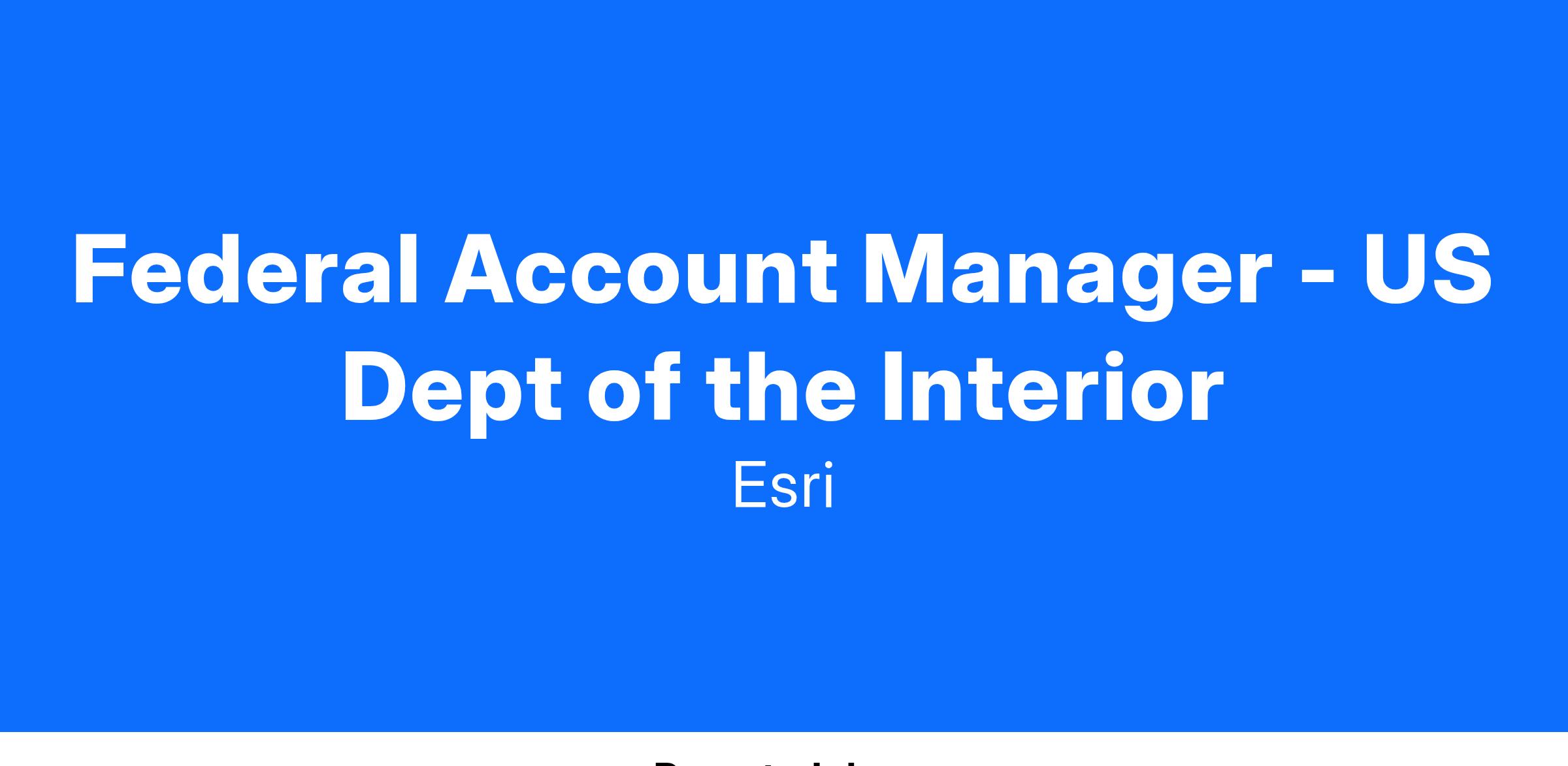 We invite you to bring your experience and passion for federal government mission areas coupled with an understanding of applying geospatial technology to become an integral part of Esri’s US Dept of the Interior account team. We’re looking for an individual who is customer oriented and a collaborative team player who enjoys identifying and implementing strategies that will radically improve the challenges organizations face. You’ll work closely with a team that helps our new and existing US Department of the Interior customers optimize and expand adoption of Esri technology, identify new areas of growth, and deliver expertise that helps deliver on their mission.
