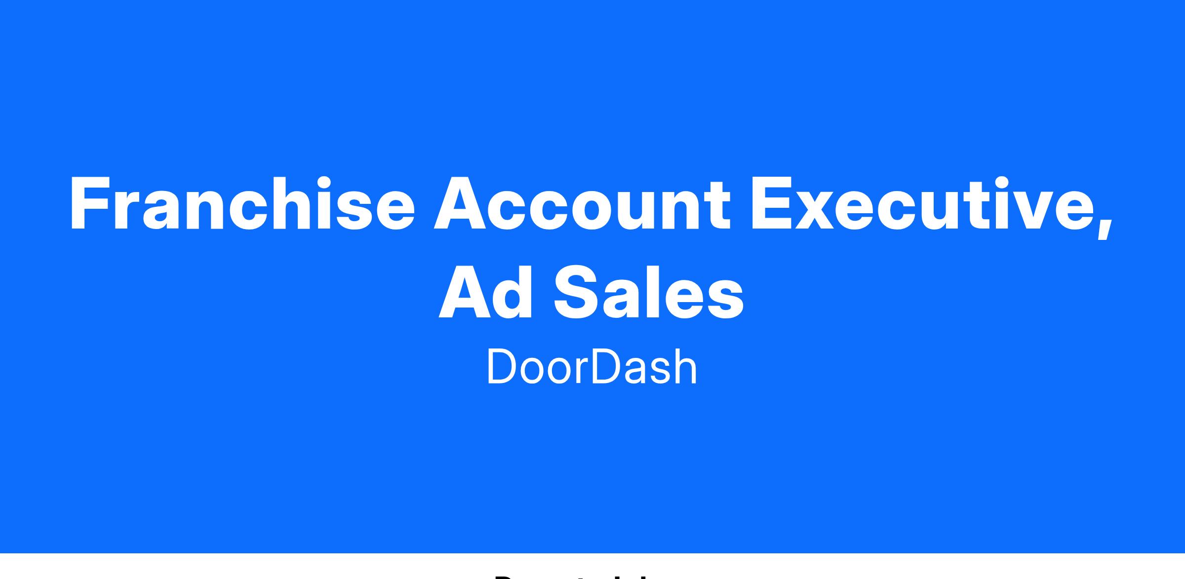 As an Account Executive, Enterprise Restaurant Accounts, you will build partnerships that create tangible value for both DoorDash and advertisers. In this role, you will manage the ads strategy across franchises within a set portfolio of Enterprise Restaurant accounts, and drive growth and adoption of our growing ads and promotions offering. You will work on both developing new business and growing existing business. You will also work cross-functionally with account management, marketing, analytics, and product to innovate on our future approach and solutions. You will report into a Manager, Restaurants in our Enterprise Sales & Business Development organization.