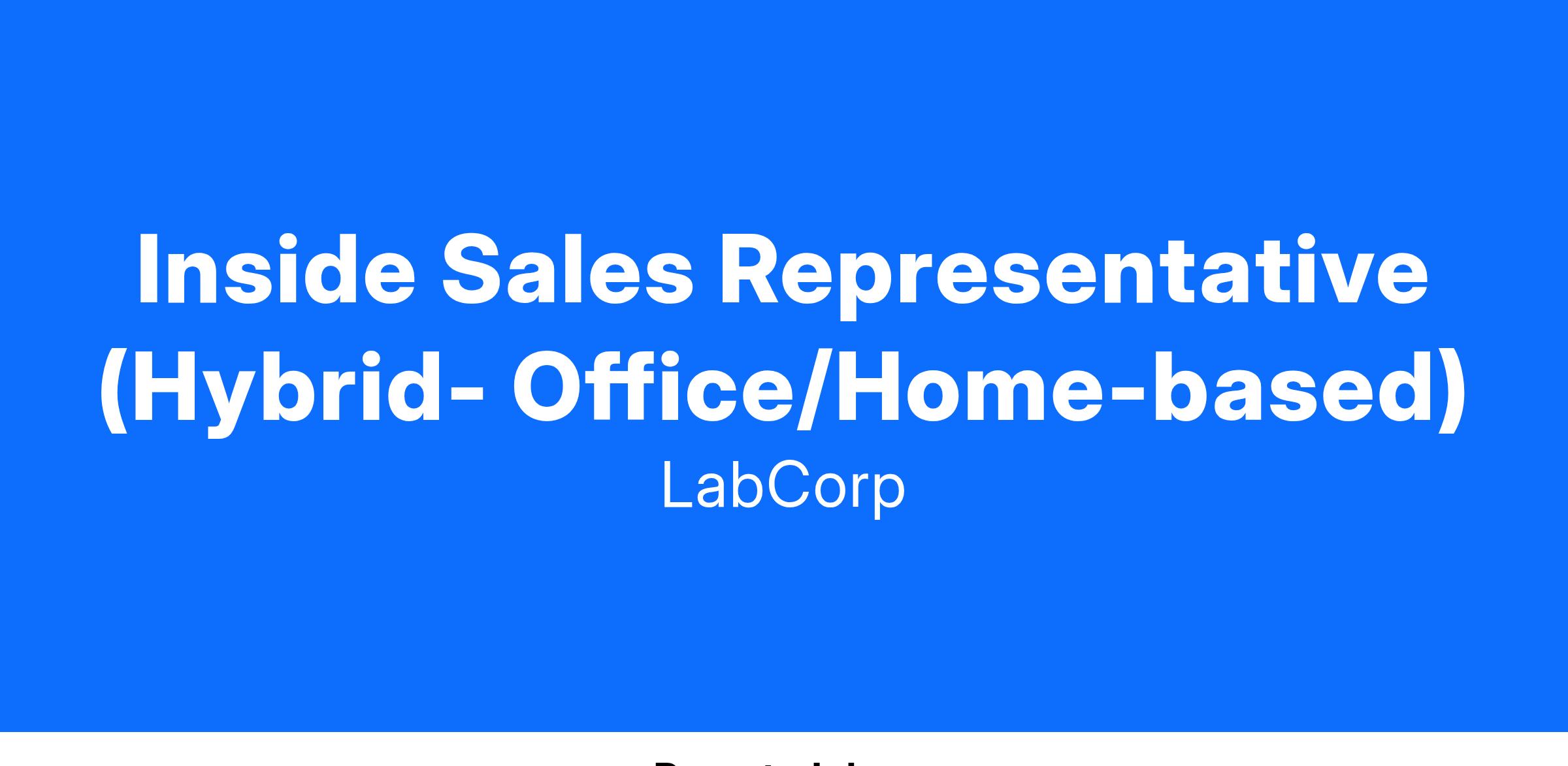 Recognized as one of Forbes’ 2022 “World’s Best Employers” and named to the Disability Equality Index’s 2022 list of “Best Places to Work for Disability Inclusion." Labcorp is seeking to hire an Inside Sales Representative to help manage relationships that increase loyalty and accessioning volume across an assigned territory of existing small to medium sized clients. This person work will a hybrid schedule (3 days a week in office, 2 days a week at home).