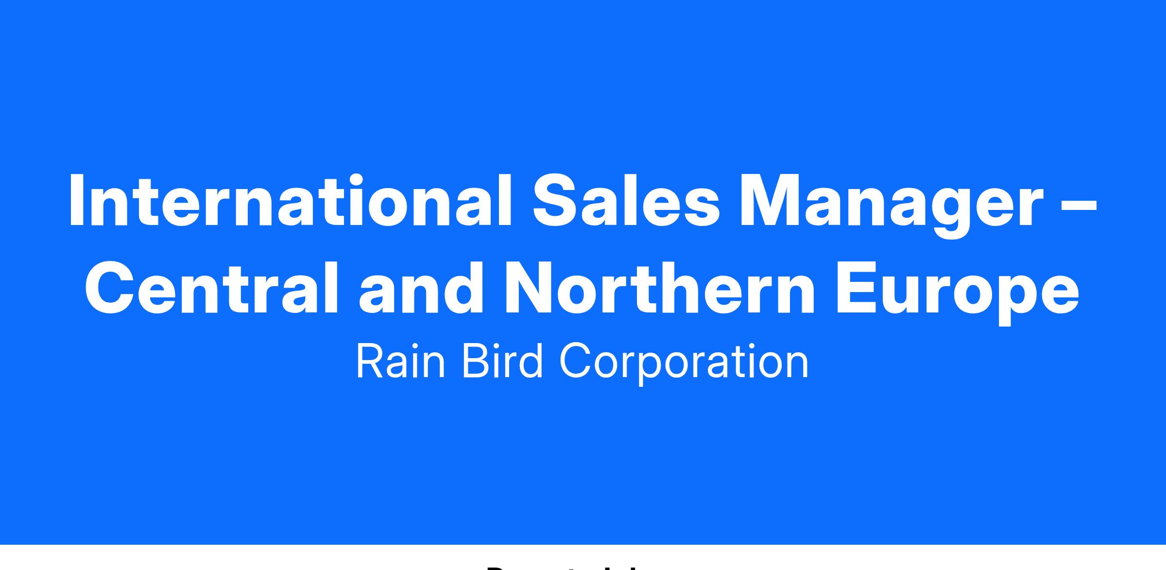 The International Sales Manager – Central and Northern Europe will report directly to Rain Bird Europe’s General Manager and will be responsible for creating and driving sales growth and product strategies for our landscape segment in UK, Benelux, Germany, Switzerland, Austria, Scandinavia, and Eastern Europe North. The succesful candidate will think and plan strategically and will be a key sales leader in the development and execution of the overall Rain Bird Europe’s operating plan. He/she must be collaborative, driven, high energy and have a demonstrated track record of success in both sales and business management. This position will be measured on market top line sales growth and market share growth.