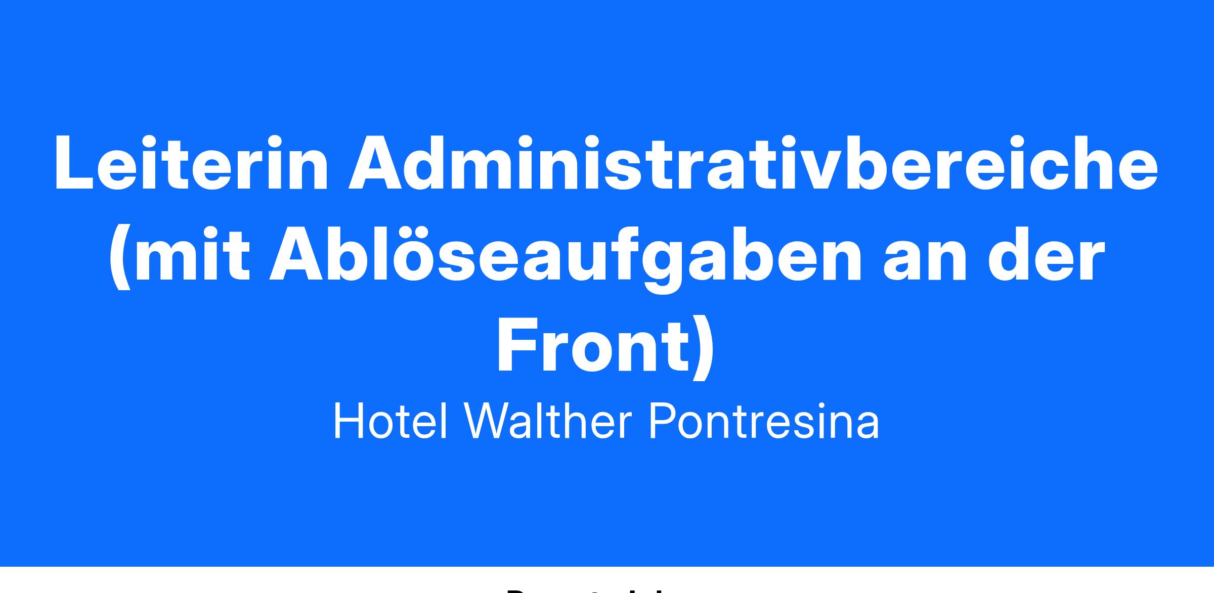 In einer Welt, die sich ständig wandelt, steht das Relais & Châteaux Hotel Walther Pontresina und das benachbarte 3* Hotel Steinbock für Beständigkeit und Verlässlichkeit. Unsere Mission ist es, Gästen und Mitarbeitern ein Gefühl von Sicherheit und familiären Werten zu vermitteln. Wir suchen eine dynamische und strategisch denkende Leiterin Administrativbereiche, die unser Team in den Bereichen Marketing, Human Resources und Revenue Management verstärkt.
