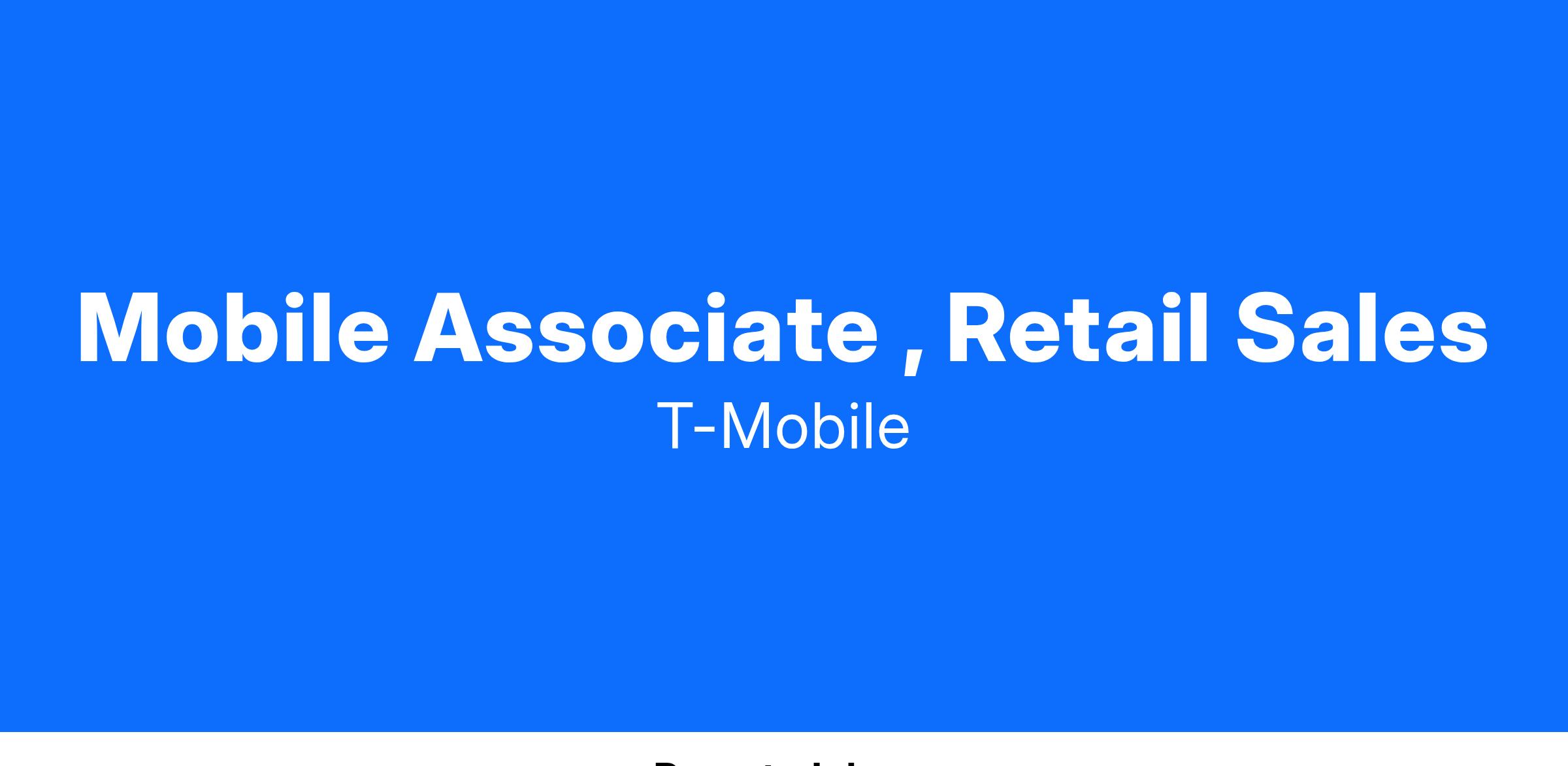 Mobile Associates (MA) work as a member of a Retail Team of Experts to bring the T-Mobile brand to life. They're brand ambassadors who build energy and excitement around our products and services. They are passionate about the connected world and thrive in a fast-paced environment, where technology innovations, customer needs, and the Retail experience are continuously evolving. They immerse themselves in significant connections with our customers, and their ability to build new and deepen existing relationships is unmatched across the wireless industry. They continuously work to build expertise in uncovering our customers' needs and have a passion to educate, demonstrate and recommend device and service solutions. This role is a learning role, where new associates are working with their team and proactively building skills and proficiencies, in preparation for the next level up as a Mobile Expert. As a Mobile Associate, you will be required to successfully complete new employee training.