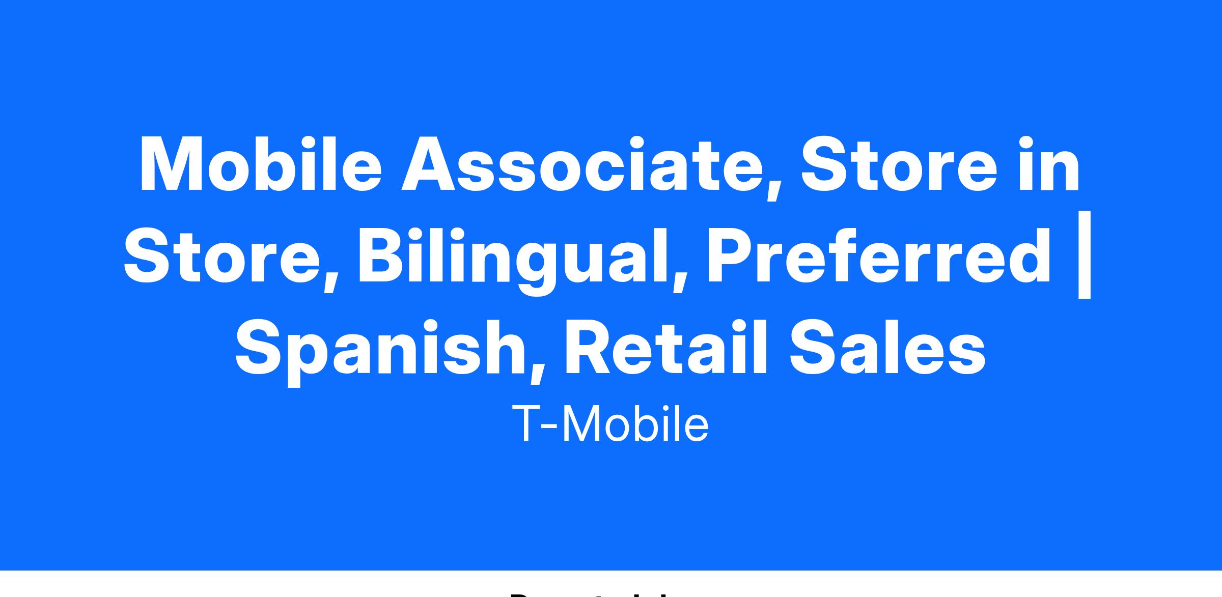 Mobile Associates, Store-in-Store are an integral part of the Retail Team responsible for bringing the T-Mobile brand to life within National Sales partner locations, where active customer engagement is crucial for success. They're ambassadors who create energy and excitement around our products and services. They are obsessed with the connected world and thrive in a high-traffic environment, where technology innovations, customer needs and the Retail experience are continuously evolving. Mobile Associates excel at building and deepening relationships with customers through meaningful interactions. They are skilled at identifying customer needs and are passionate about educating, demonstrating, and recommending solutions. Mobile Associate SiS, exceed their performance targets Doing it the Right Way, by excelling in sales, providing exceptional customer experiences, and meeting quality of sale metrics.