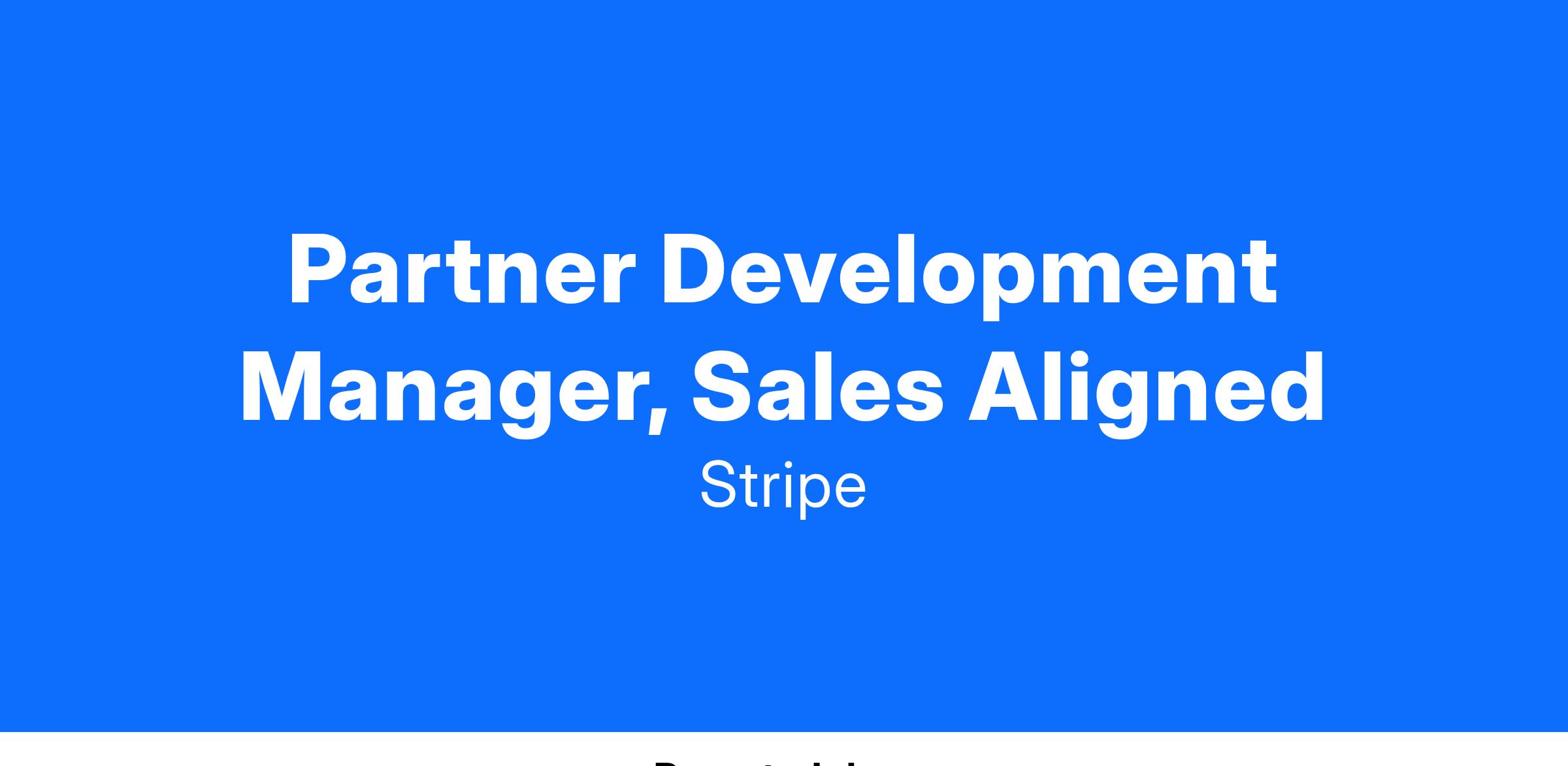 The Partner Development Manager, Sales Aligned role will support the overall success Stripe’s Alliances & Channels org, driving joint GTM (Go To Market) and co-sell success alongside Partner Development Managers and across opportunities at scale. This position is fast-paced, highly visible, and aligned to quarterly metrics. As a Partner Development Manager, Sales Aligned you will hold a holistic view of the business, generated by and engaged with Partners, and will work across the Stripe Sales segments to enhance and grow partner-related Stripe revenue.