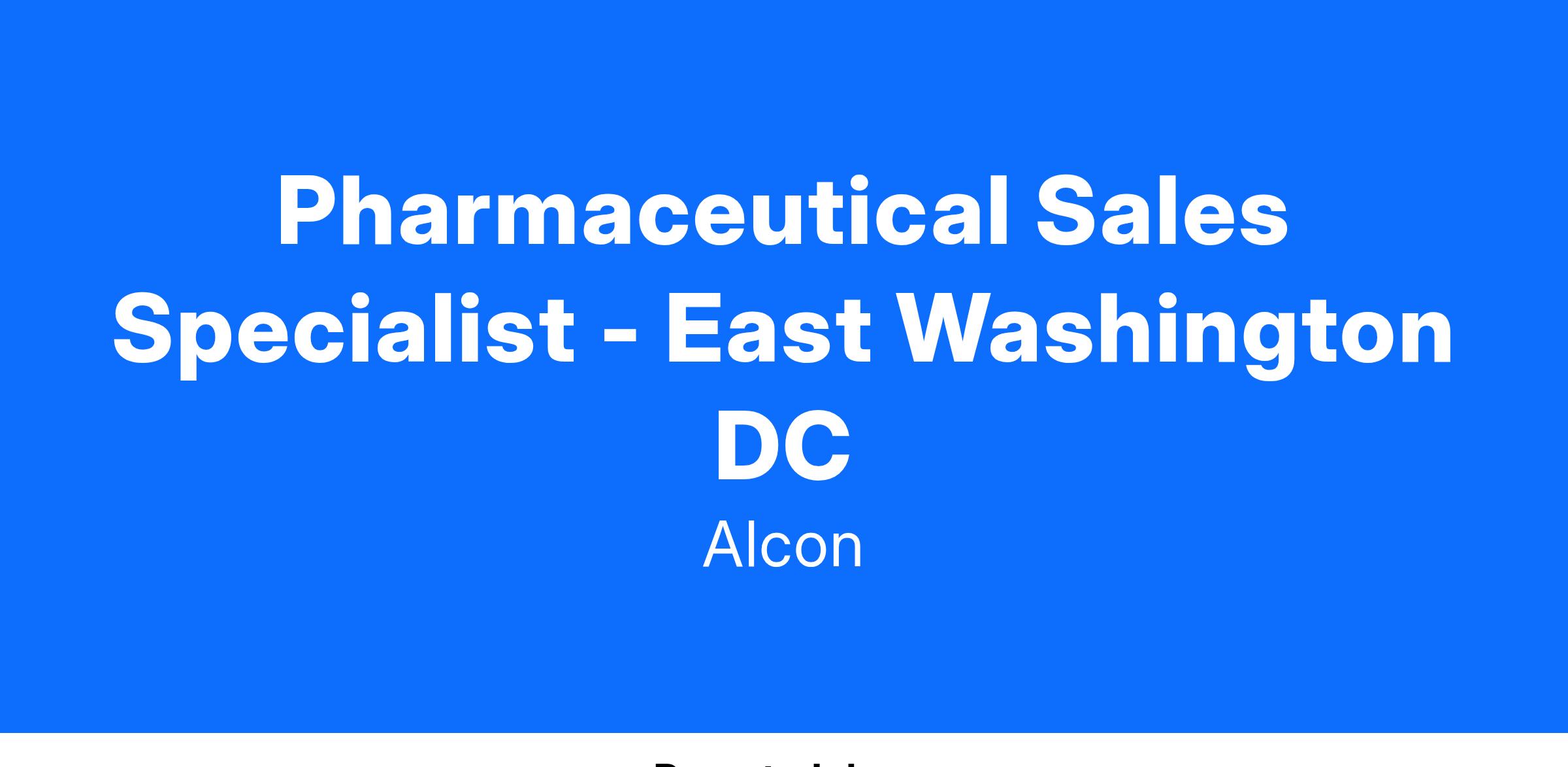 We foster an inclusive culture and are looking for diverse, talented people to join Alcon. As a Sr. Associate, Pharmaceutical Sales one will be responsible for covering a large territory and will focus on a defined target list of physicians/practitioners within the territory. One will also assure the needs of all partners are met within compliance guidelines while developing relationships and maintaining an active presence in the pharmaceutical community or associated organizations throughout the territory area of East Washington DC.