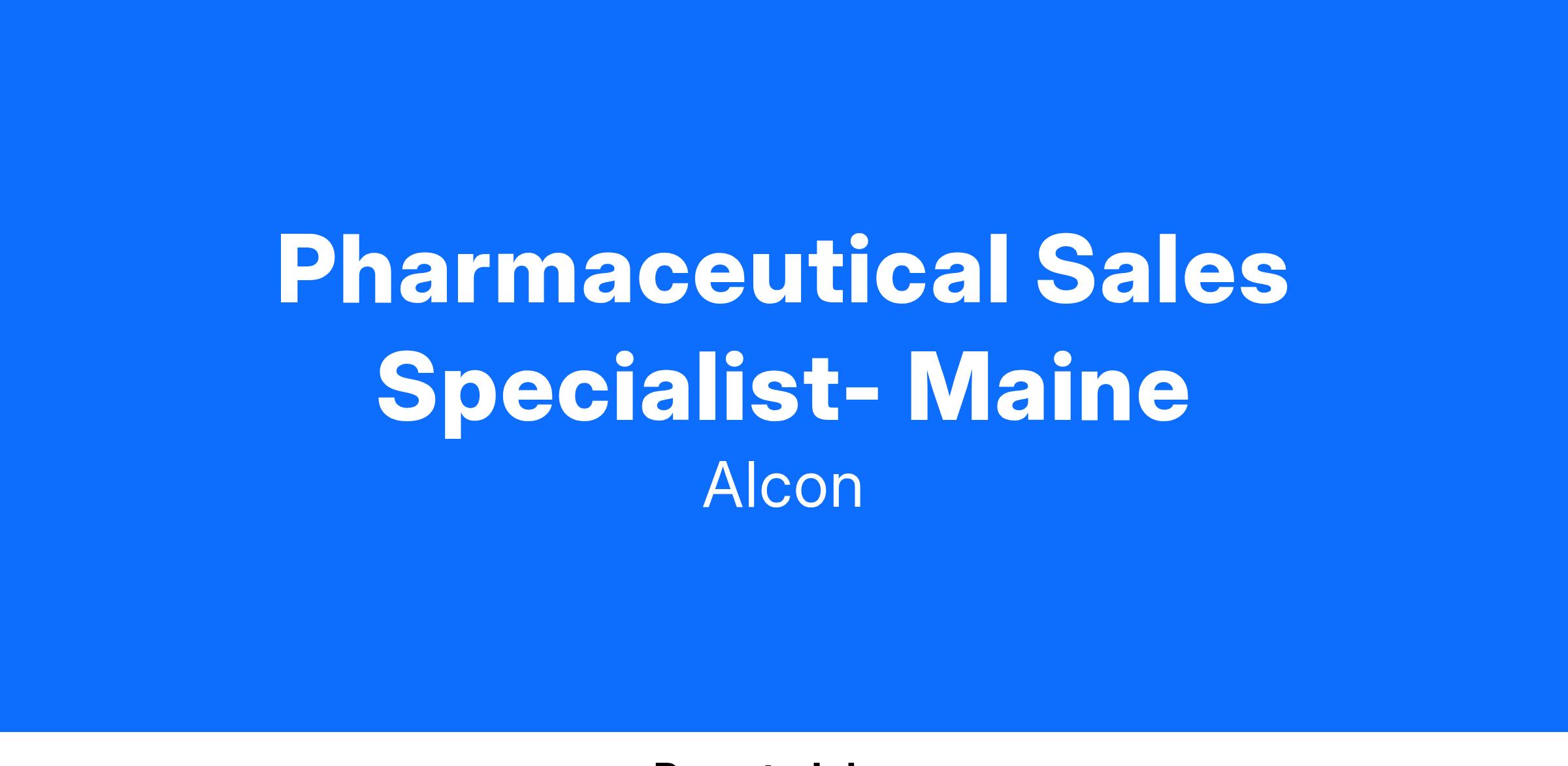 We foster an inclusive culture and are looking for diverse, talented people to join Alcon. As a Sr. Associate, Pharmaceutical Sales one will be responsible for covering a large territory and will focus on a defined target list of physicians/practitioners within the territory. One will also assure the needs of all partners are met within compliance guidelines while developing relationships and maintaining an active presence in the pharmaceutical community or associated organizations throughout the territory area of Maine.