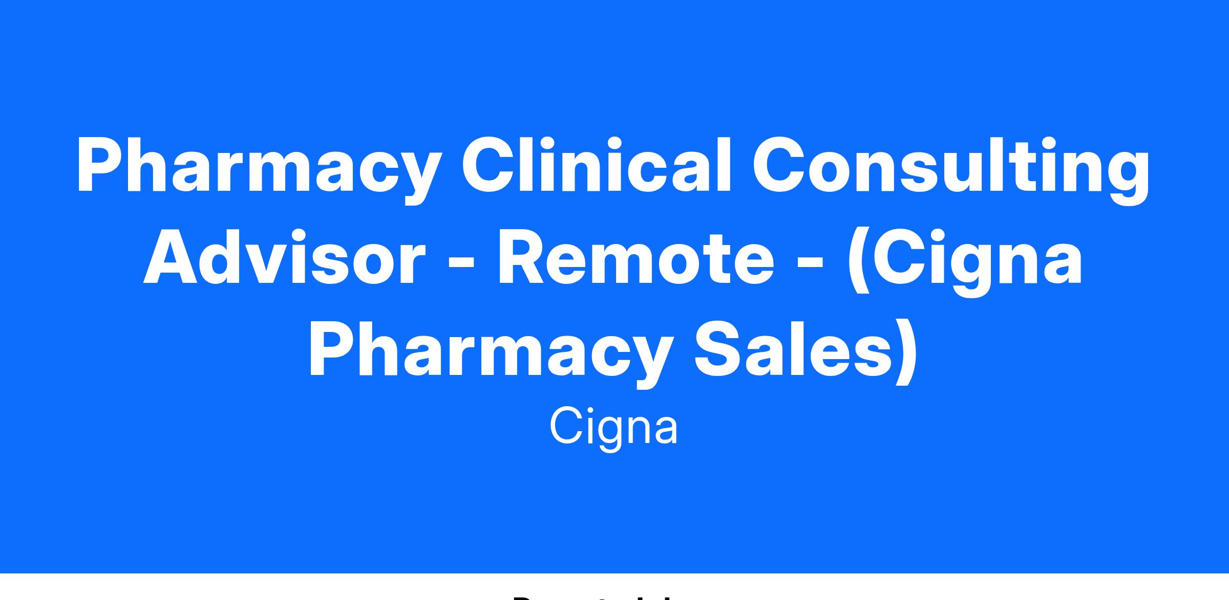 As part of Cigna Pharmacy Management, the Pharmacy Sales Advisor is a licensed clinician who serves as the primary pharmacy benefits subject matter expert supporting Cigna Pharmacy clients within an assigned geographical market(s) and client size band.