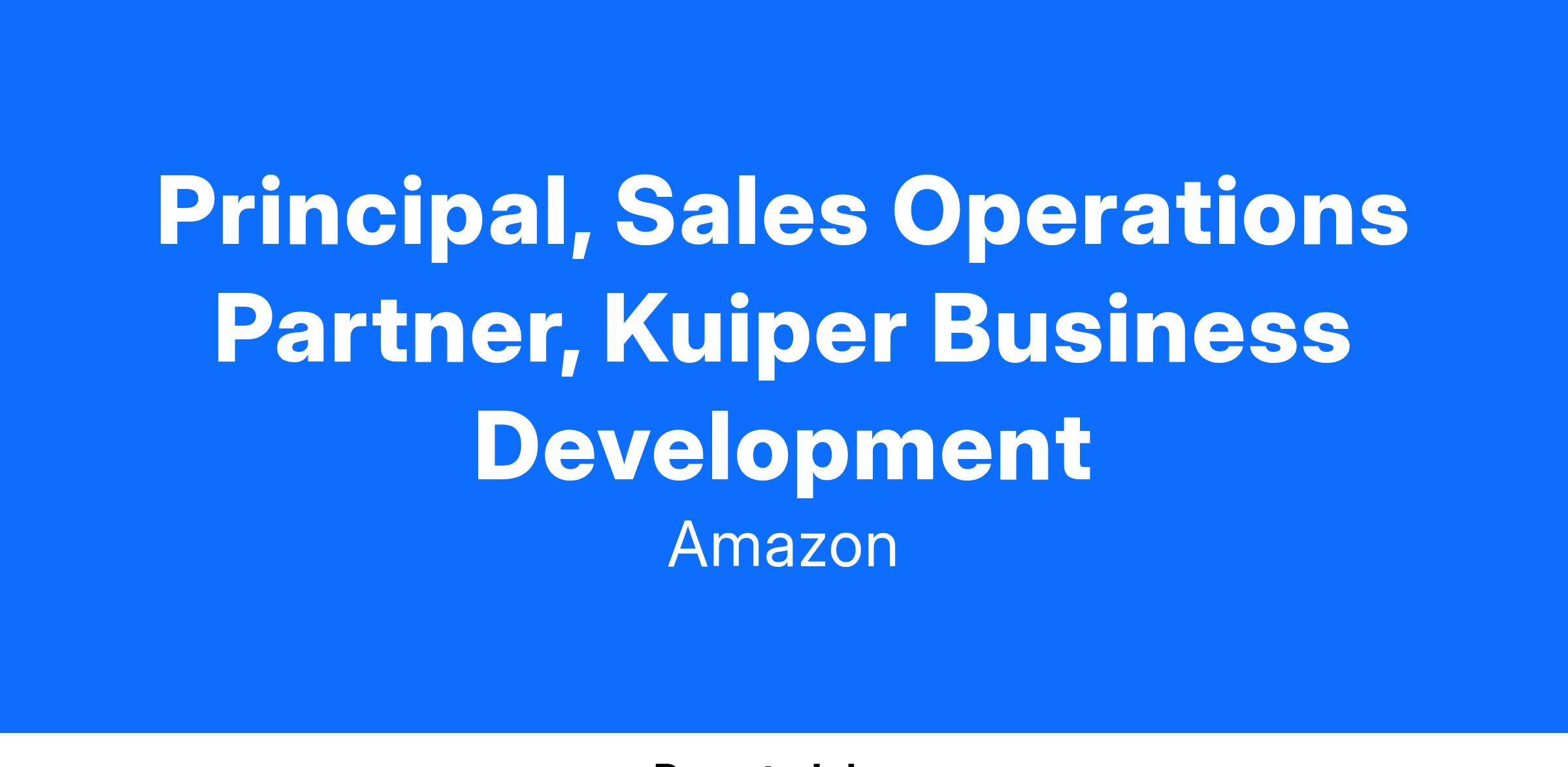 The Principal Sales Operations, Onboarding is a key leader in the Commercial Revenue Operations of Kuiper. They will build and run processes to ensure a smooth, efficient, and compliant transition of new and renewed B2B clients from contract signing to recording. The role serves as a bridge between sales, sales operations, deal desk, legal, Field Operations, Customer Success, and Service Delivery teams, ensuring all contractual obligations are documented and executed. The successful candidate will have experience leading complex strategic initiatives across global programs with cross-functional stakeholders. They will thrive in tackling ambiguous strategic challenges, use data and customer insights to inform decision-making, and have proven experience in implementing and delivering successful customer operations programs and strategies.
