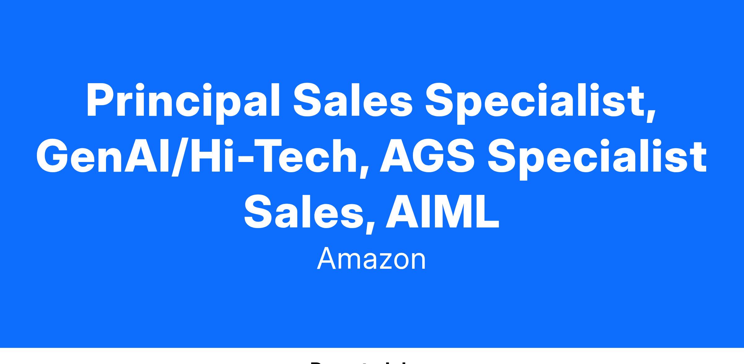 Are you a customer-obsessed builder with a passion for helping customers achieve their full potential? Do you have the business savvy, Artificial Intelligence and Machine Learning background, and sales skills necessary to help companies transform their industries by positioning Amazon Web Services (AWS) as the Generative AI service provider of choice? Do you love building new strategic and data-driven businesses? Do you want to join Generative AI Specialty sales organization, one of the fastest-growing organization within AWS? Join the US AWS Global Sales organization as a Generative AI and Machine Learning Specialist Seller!