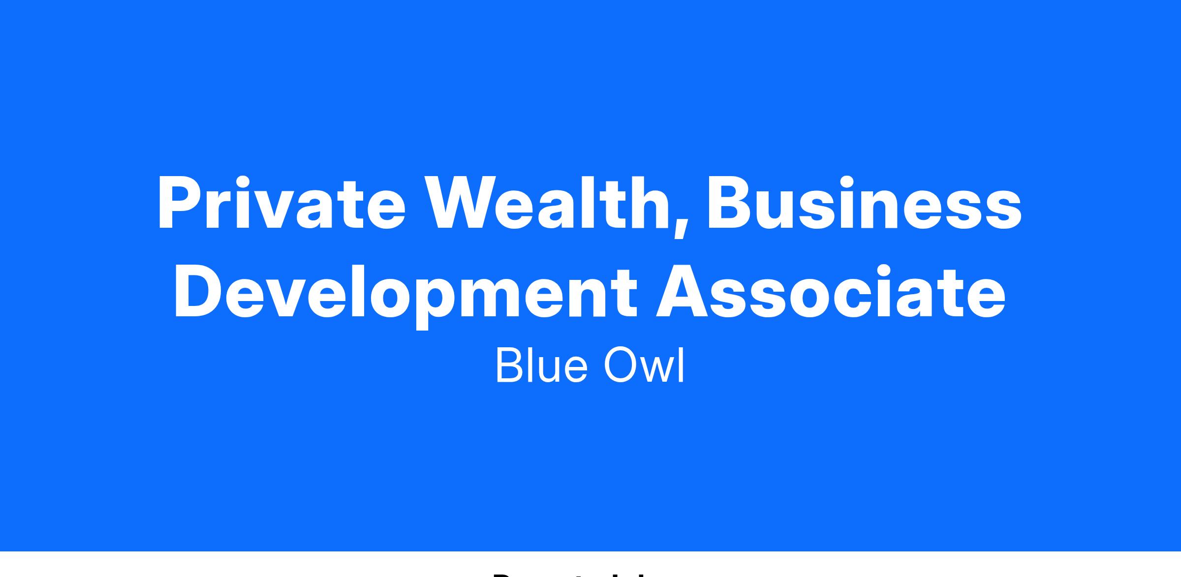 The Business Development Associate (BDA) role is an essential part of our Private Wealth sales team and tasked with accelerating the adoption of Blue Owl investment solutions. The Associate will partner with a Market Team to cultivate relationships with financial advisors within a designated channel and territory, maintaining a high level of proactive sales outreach and representing themselves as a subject matter expert for our investment offerings. The role is a hybrid sales role and expected to be in territory 1-2x a month.