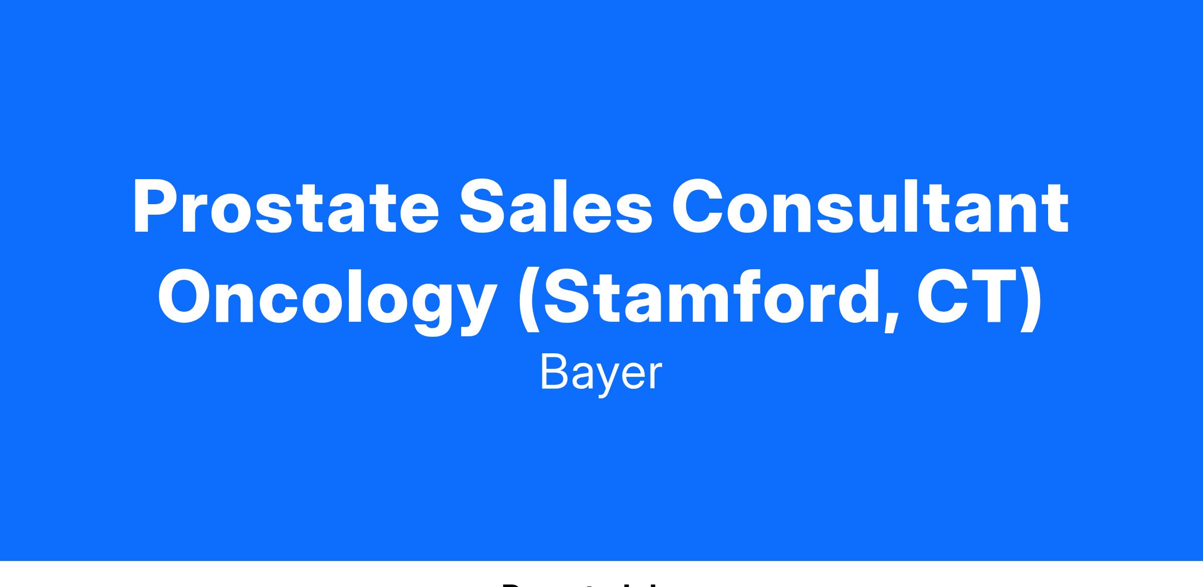 The Oncology Sales Consultant – Prostate is responsible for driving clinical demand, education, and sales of Bayer Prostate Oncology Portfolio (currently NUBEQA and XOFIGO) as determined by market dynamics in the assigned geography, to healthcare professionals in both free-standing community clinics, treatment centers and hospitals/IDNs in the assigned geography. The Oncology Sales Consultant is part of the Area Customer Squad responsible for commercializing Bayer's Prostate Oncology products and supporting customers in their geography. The span of coverage will be the Stamford, CT territory including the following metropolitan areas: New Haven, CT; Bridgeport, CT; Waterbury, CT; Stamford, CT, White Plains, NY and Lower Hudson County in NY. Travel up to 50% within the territory. The candidate must be domiciled within the territory.