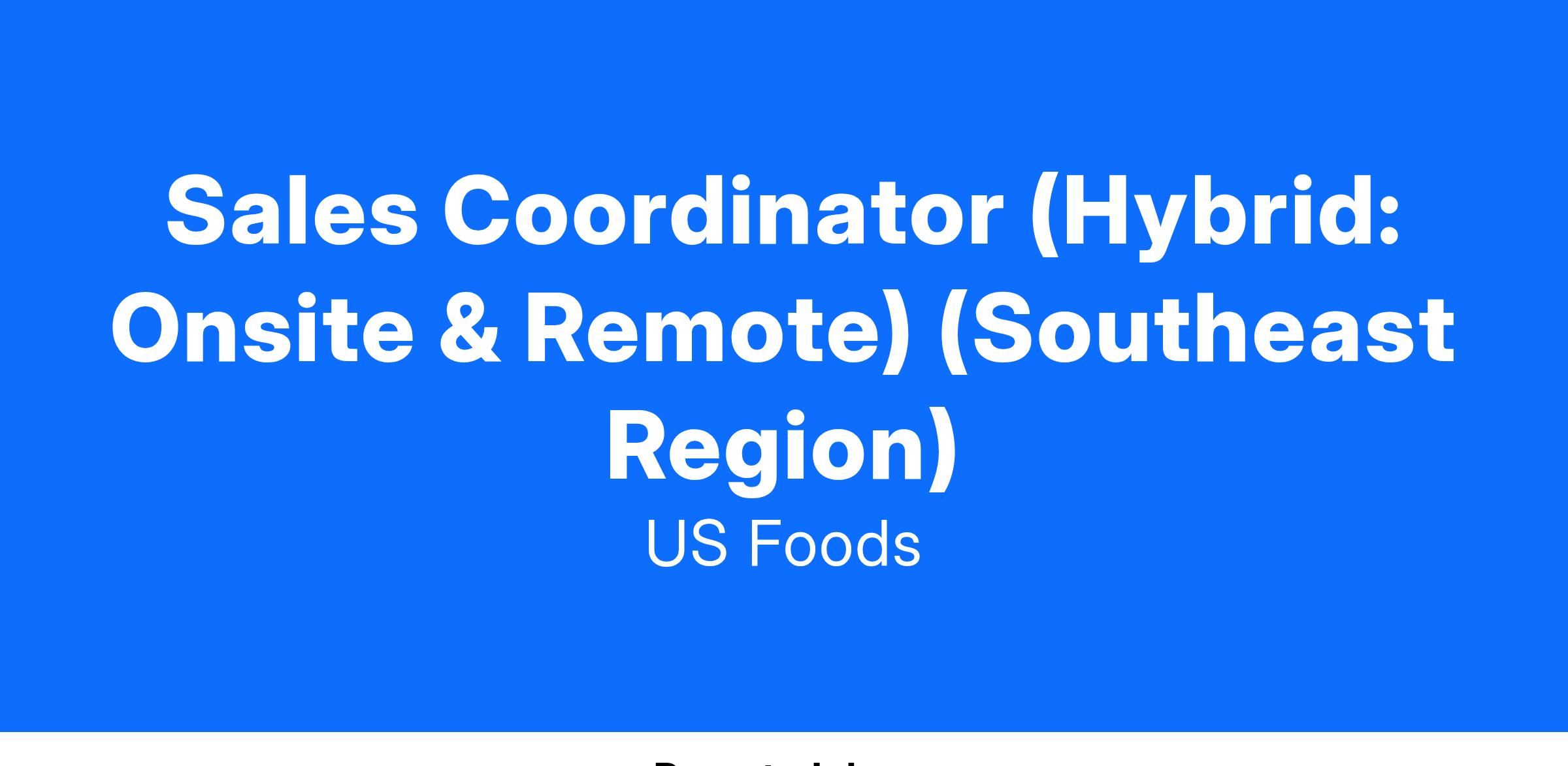 This position has been segmented as hybrid meaning the work is a combination of approximately 90 percent remote/virtual and 10 percent onsite at distribution center offices located anywhere in the Southeast Region of the United States as follows: Hurricane WV, Salem VA, Raleigh NC, Charlotte NC, Fort Mill, SC, Lexington SC, Port Orange FL, Boca Rotan FL, Tampa FL, Marrero, LA, Flowood MS, Montgomery, AL, Little Rock, AR, Memphis, TN, Alcoa, TN, Norcross, GA, Fairburn, GA, within a 50 mile distance to the listed Distribution Offices.Ready to build a career with a company that’s leading the foodservice industry?