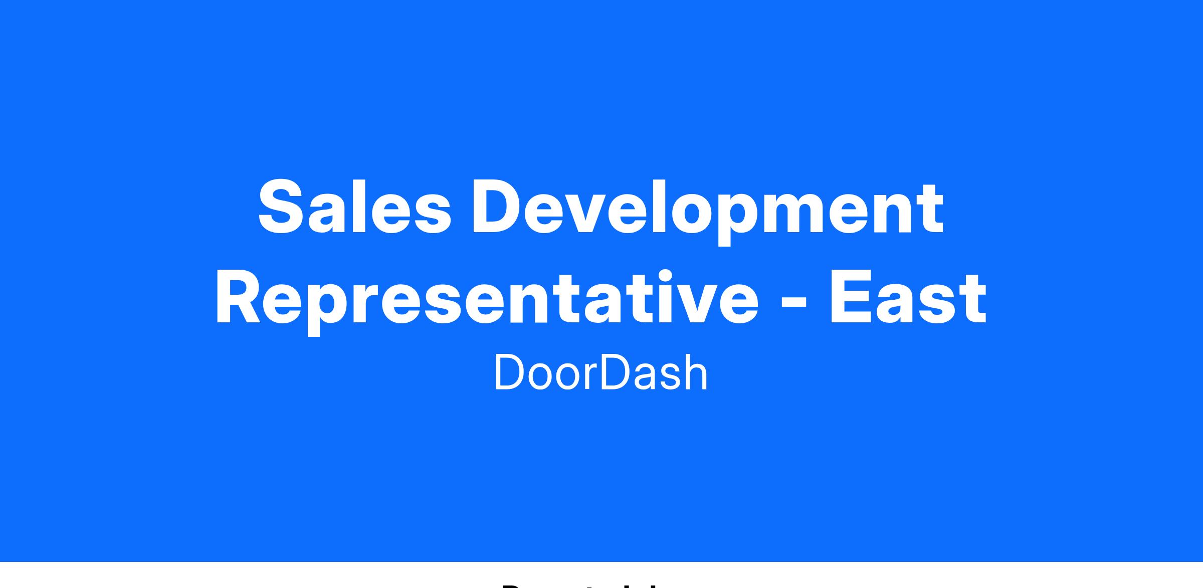 We're looking for a Sales Development Representative to join our Outside Sales team to bring the best local and regional merchants on to DoorDash's platform! As a Sales Development Representative, you'll join a team of experienced operators who have excelled in the art of booking qualified meetings. As part of the team you'll support a region and all the opportunities within it! The team is laying the foundation for what will eventually be the single biggest competitive advantage for DoorDash — industry-leading partnership terms with the best merchants.