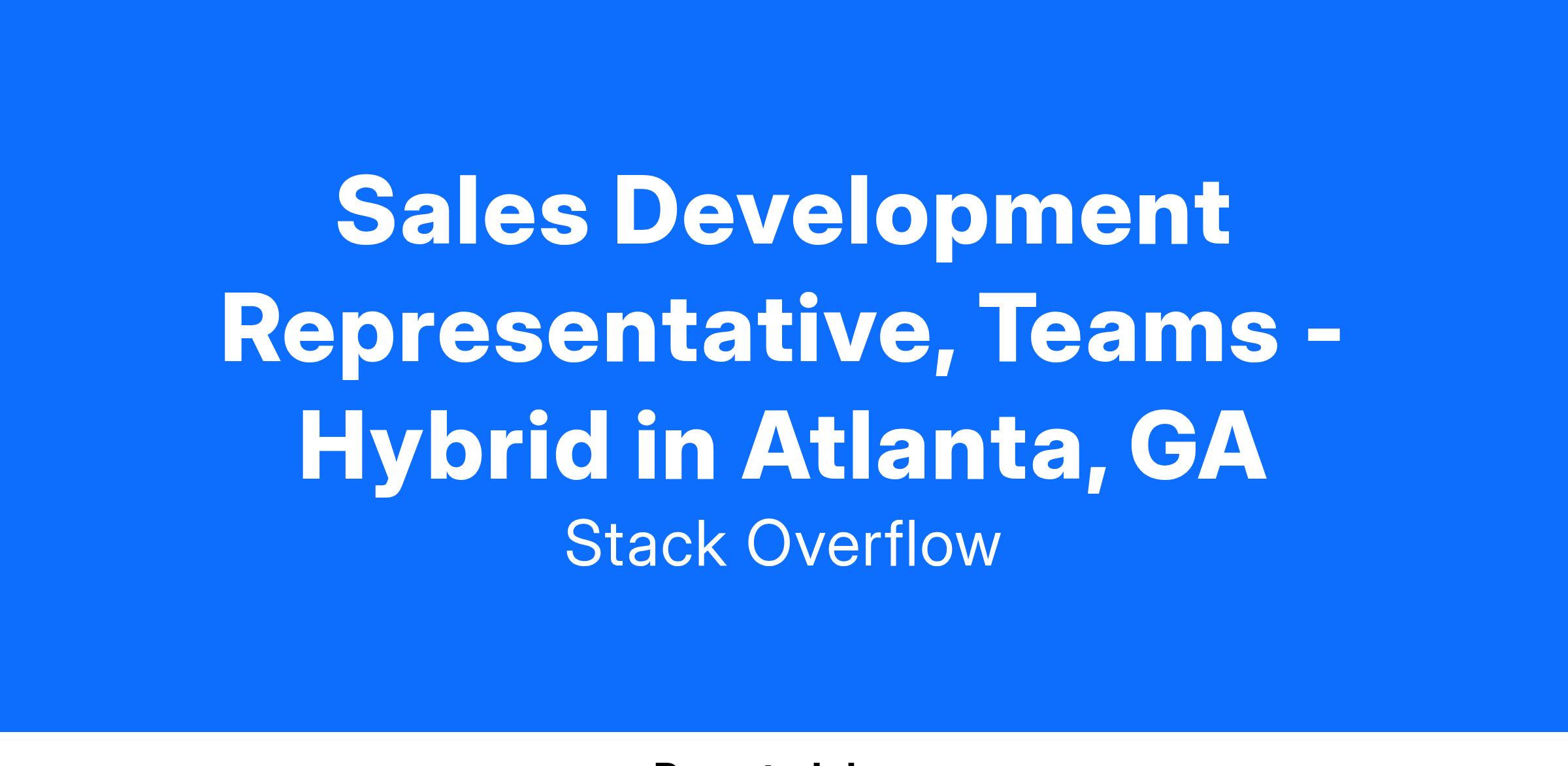 The Sales Development Representative (SDR) is a critical part of our high-performing sales team. As an SDR, you will be responsible for uncovering and developing qualified opportunities from inbound leads as well as via creative outbound prospecting for our Stack Overflow for Teams Sales Team. Reporting to the Director of Sales Development, you will be challenged, you will develop as a sales professional, and you will have fun!