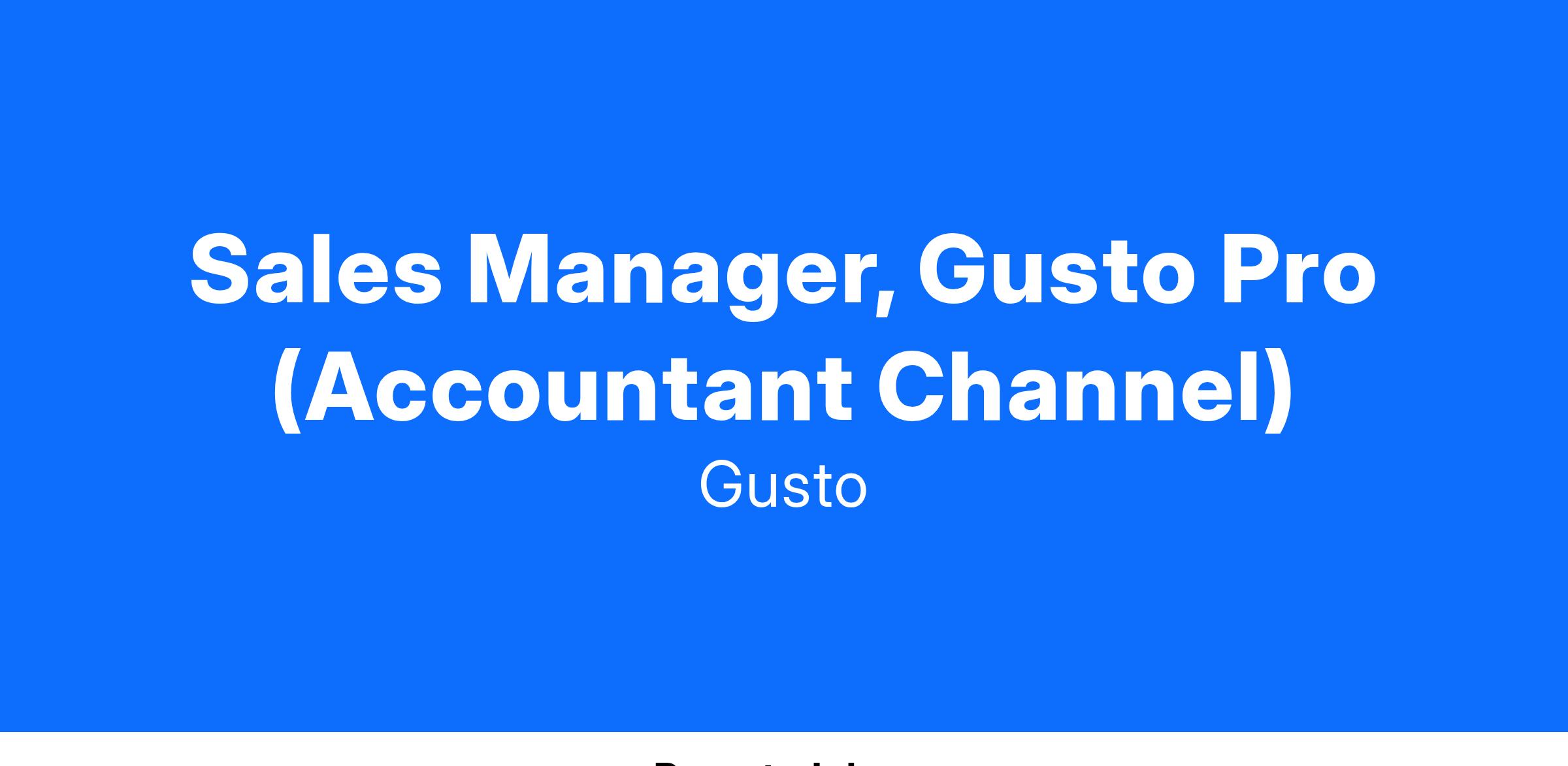 Gusto is seeking a Sales Leader to lead our Gusto Pro Sales Team, dedicated to driving Gusto's growth in the SMB space through channel relationships with accounting partners. He/she will be responsible for net new revenue from our accounting partners, as well as ramping our existing firms to move their clients onto Gusto. The Gusto Pro Sales Leader will also help hire, train, and coach our Advisors to be a world-class consultative acquisition team. The pace in Gusto sales is fast and the landscape we’re playing in is ever-changing, and we’re looking for a dynamic, passionate, people leader who is motivated by that, and brings a good sense of humor to a team that is motivated to work hard and have a little bit of fun while doing it.