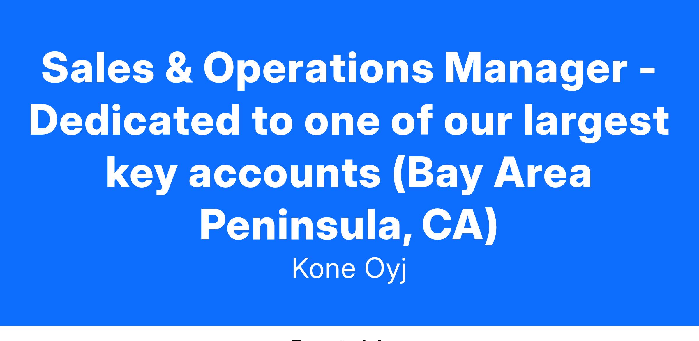 Are you ready to make your next career move to join our team and manage your own portfolio as a Sales and Operations Manager for KONE Bay Area Peninsula, CA?