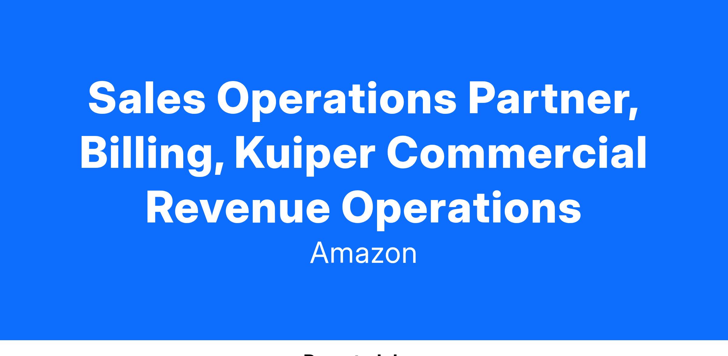 The Sales Operations, Billing leader is a key member of the Kuiper Commercial Revenue Operations team. This role will manage the bill run efforts for Kuiper with accurate and timely metering, revenue recognition, accruals, and audits. In this role, you should be comfortable juggling between thinking big and the operational nuances of the work. You must also be a self-starter with strong analytical and planning ability while being able to navigate the ambiguous landscape of Kuiper business.