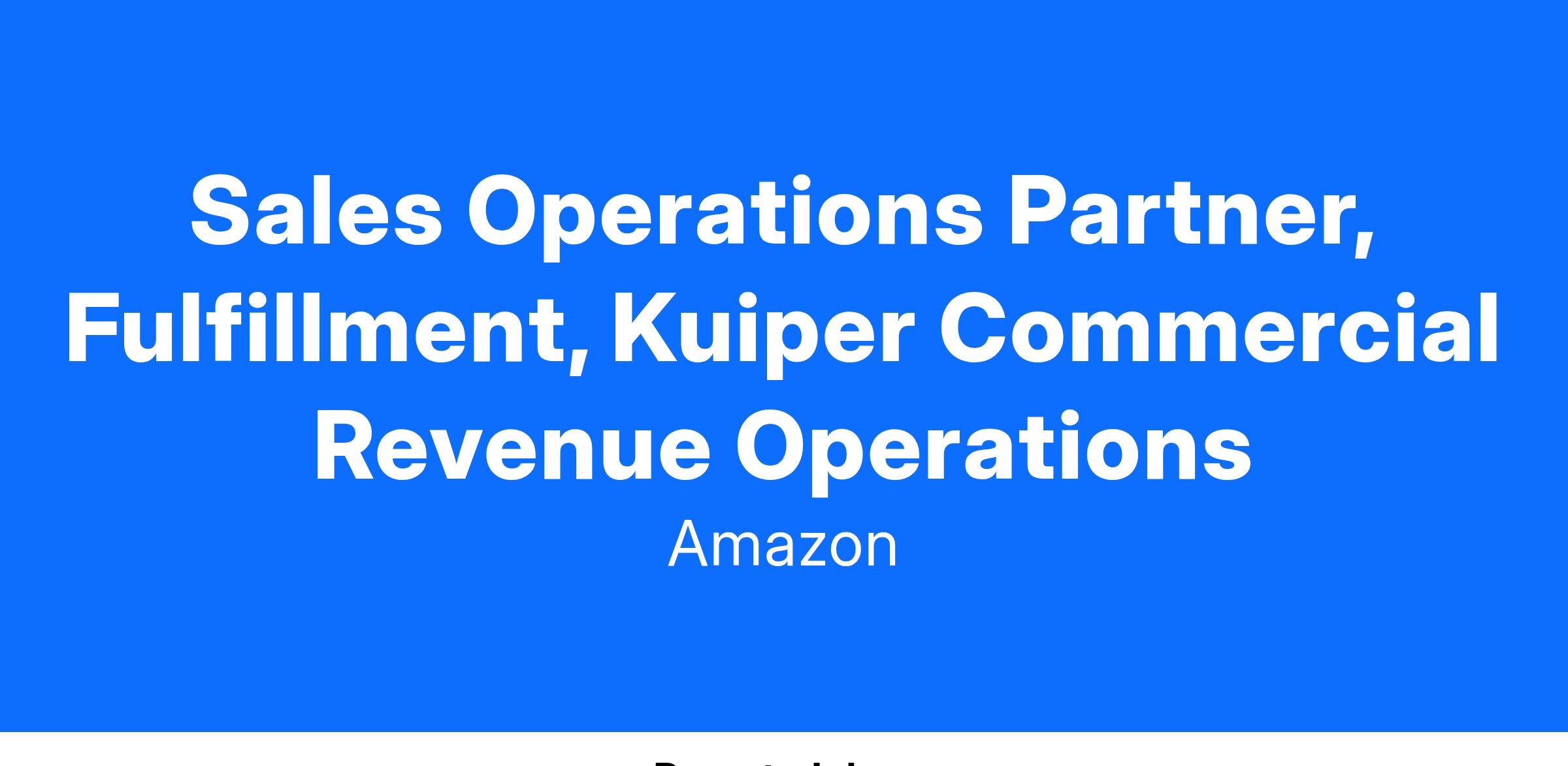 The Sales Operations, Fulfillment and Field Operations leader is a key part of the Commercial Revenue Operations of Kuiper. They will drive the processes in delivering and provisioning services to subscribers, ensuring a smooth and efficient customer experience. They will also optimize the efficiency and effectiveness of field technicians and teams responsible for installing, maintaining, and repairing infrastructure and services. The successful candidate will have experience leading complex strategic initiatives across global programs with cross-functional stakeholders.