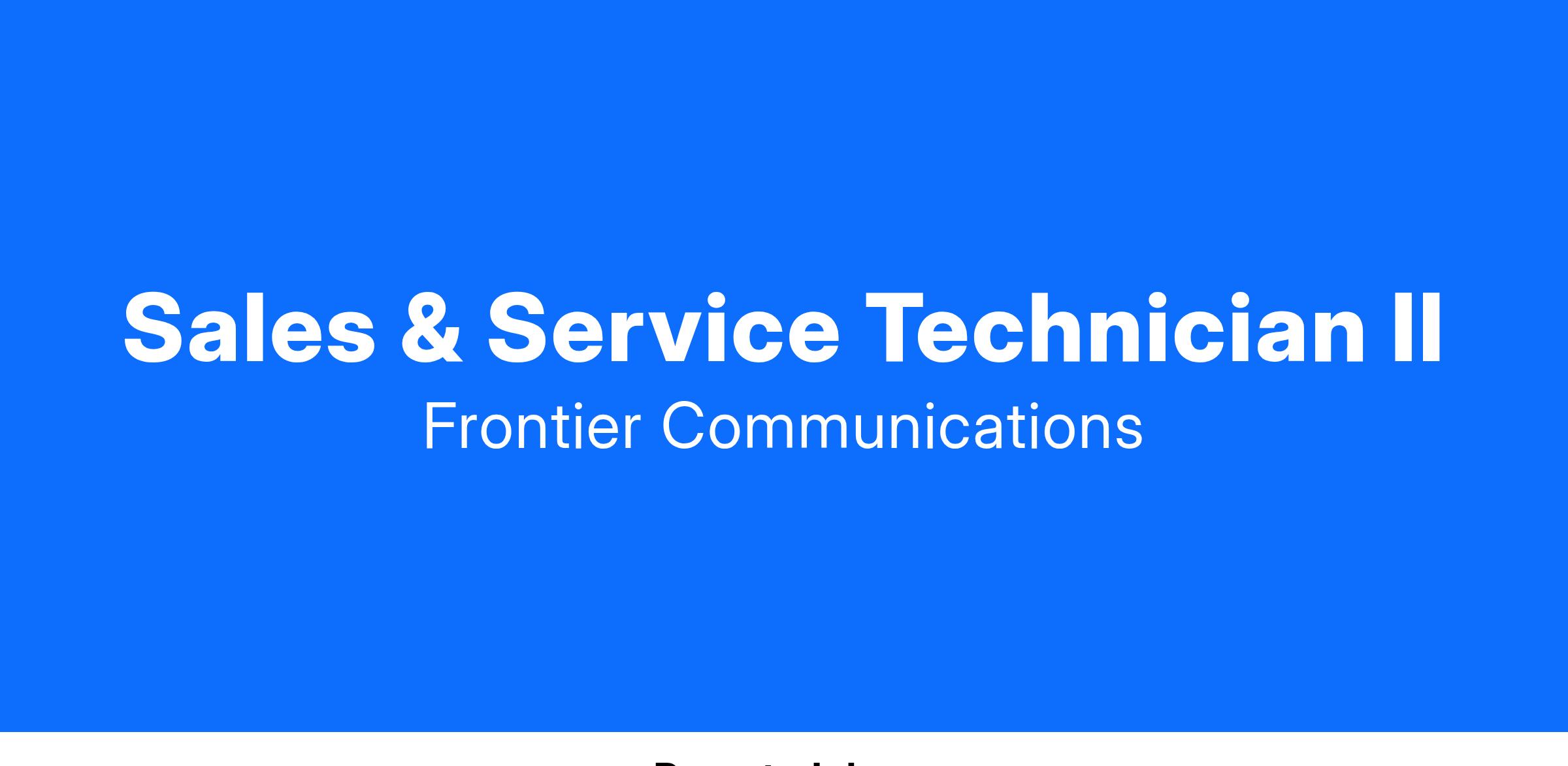 Frontier Communications is an Affirmative Action and Equal Opportunity Employer. All qualified applicants will receive consideration for employment without regard to race, color, religion, sex, sexual orientation, gender identity, national origin, or protected veteran status and will not be discriminated against on the basis of disability.
