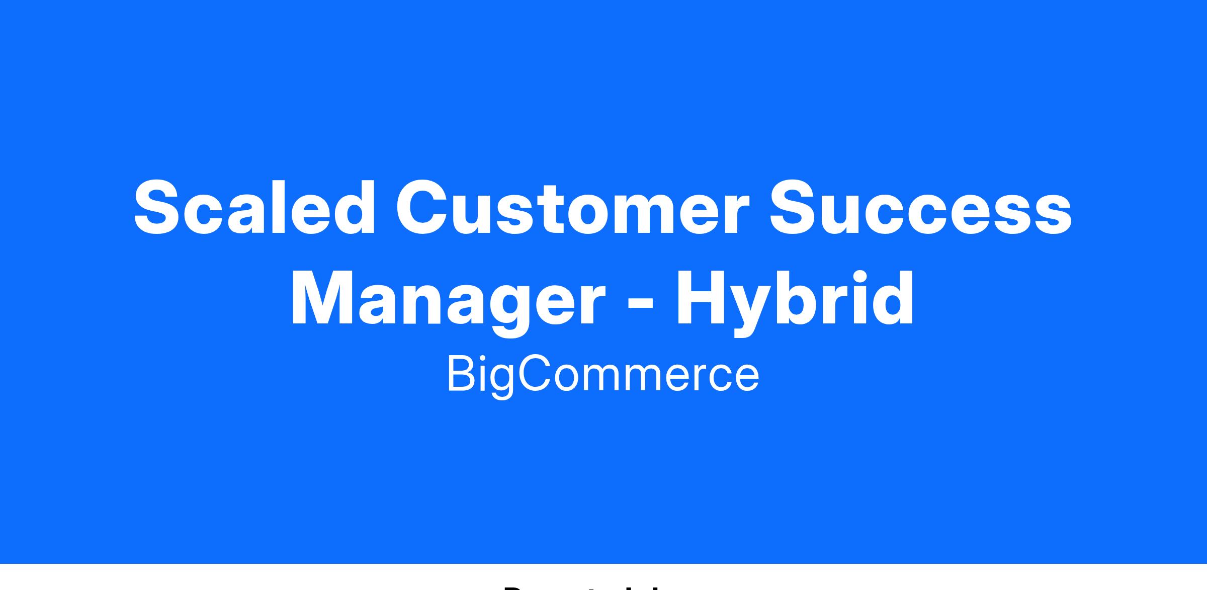 BigCommerce , named a "Best Place to Work" in several cities, is looking for a Scaled Customer Success Manager . As a Scaled Customer Success Manager, you will be responsible for managing both 1:1 engagements focused on high-impact objectives and many success programs designed to drive value and retention across targeted client groups. Your role will combine personalized strategies for high-priority clients with scalable initiatives to ensure broad customer success and continued product adoption.