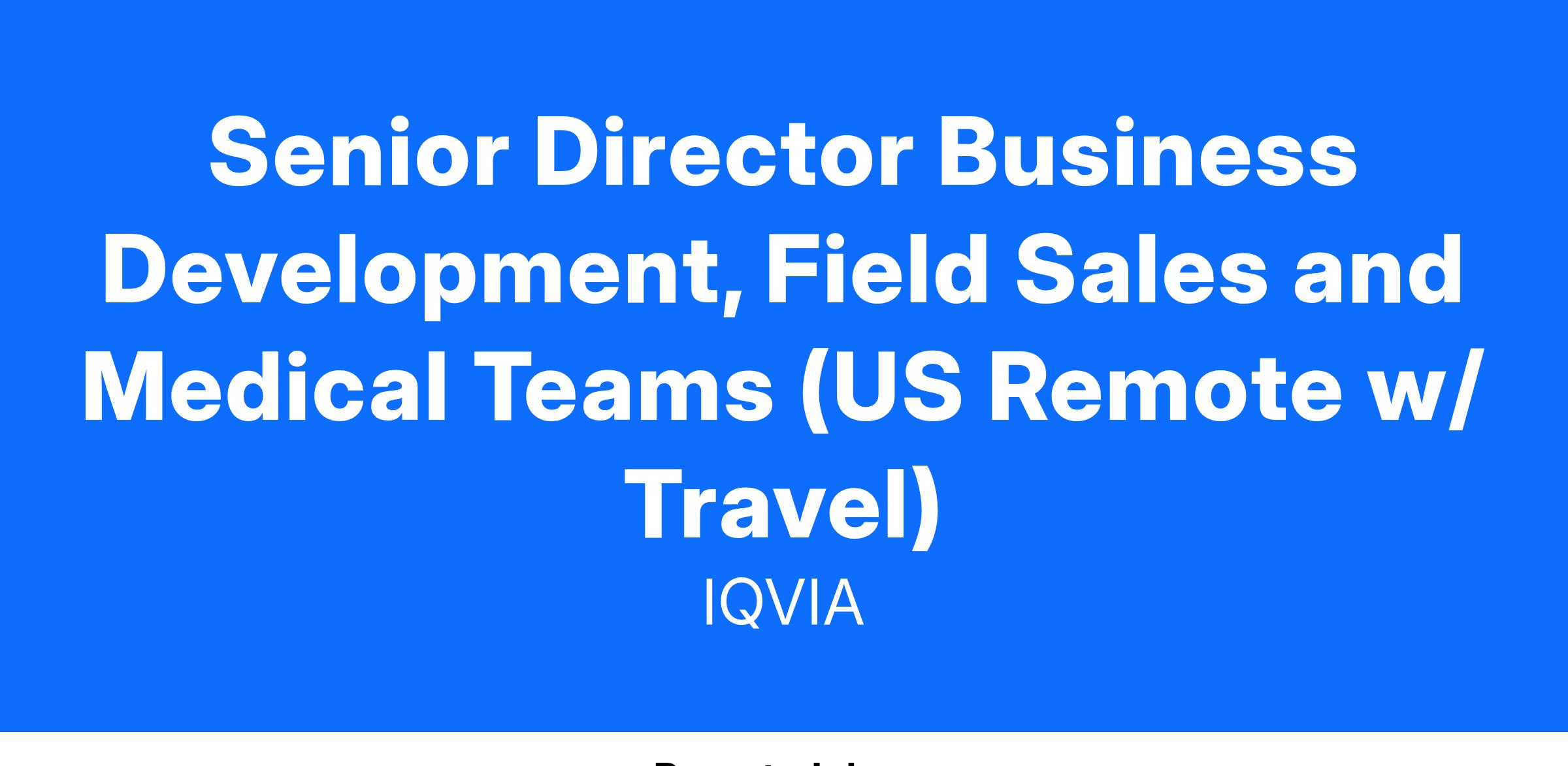 Overview: Are you ready to drive significant growth and make a substantial impact in the pharmaceutical sector? IQVIA is seeking a visionary Senior Director of Business Development, Field Sales, and Medical Teams to lead our strategic business development initiatives. In this high-impact role, you will be at the forefront of building and nurturing client relationships, achieving ambitious sales goals, and uncovering new business opportunities. You will play a crucial role in contributing ~$5 Million Individual TCV.