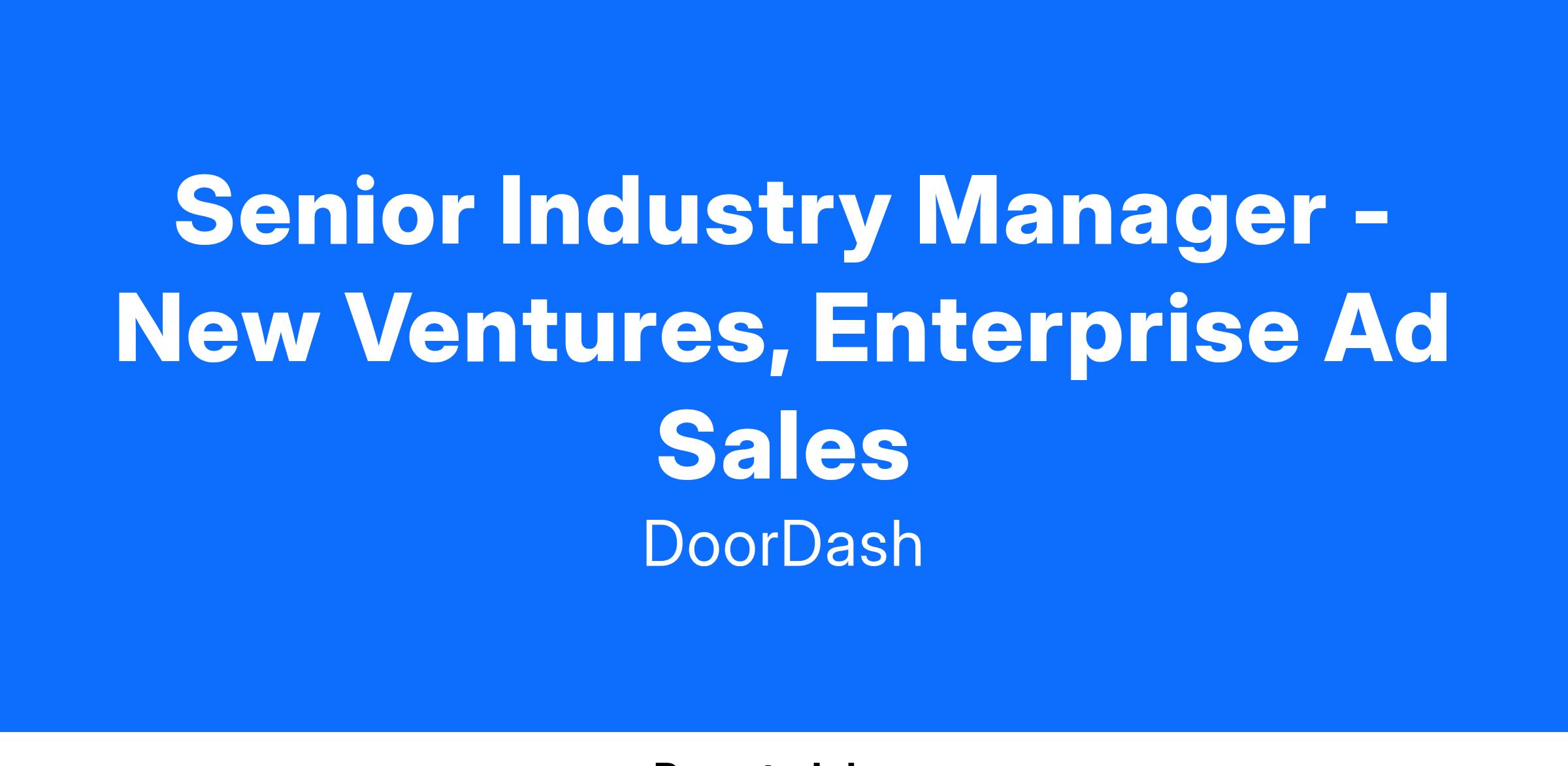 As the Senior Industry Manager - New Ventures, Enterprise Ad Sales, you will build and lead a sales team focused on some of DoorDash’s newest advertising horizons including media agencies, offsite media and new verticals (retail, convenience, and grocery verticals). You will be responsible for working cross-functionally to establish the go-to-market motion that meets and exceeds mutual goals of these advertiser audiences and DoorDash. In this role, you will operate entrepreneurially yet build on the learnings of the existing broader verticalized sales teams (CPG and Restaurant). You will report into the Senior Director, Enterprise Ad Sales and be a key member of the Ad Sales Leadership team within our Sales & Business Development organization.