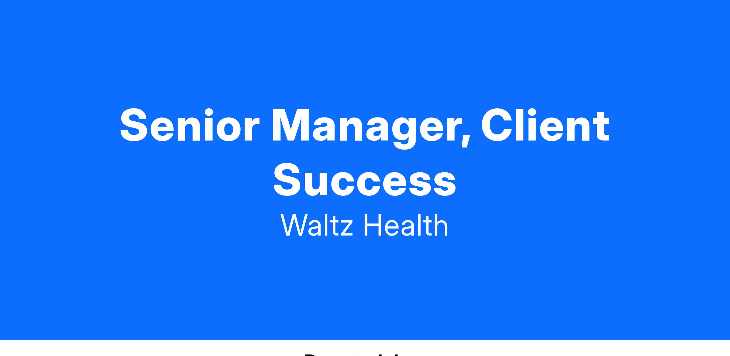 Waltz Health is looking for a driven, relational, and analytical Senior Manager, Client Success to lead and grow our relationships with clients. As a Senior Manager, Client Success, you will be the subject matter expert of clients within your portfolio – owning immediate client escalations, managing long term partnership growth, and functioning as the operational voice of the client within Waltz Health. You will also be responsible for regular reporting to client and internal Waltz stakeholders, tracking success to agreed upon metrics and driving improvements in program value.
