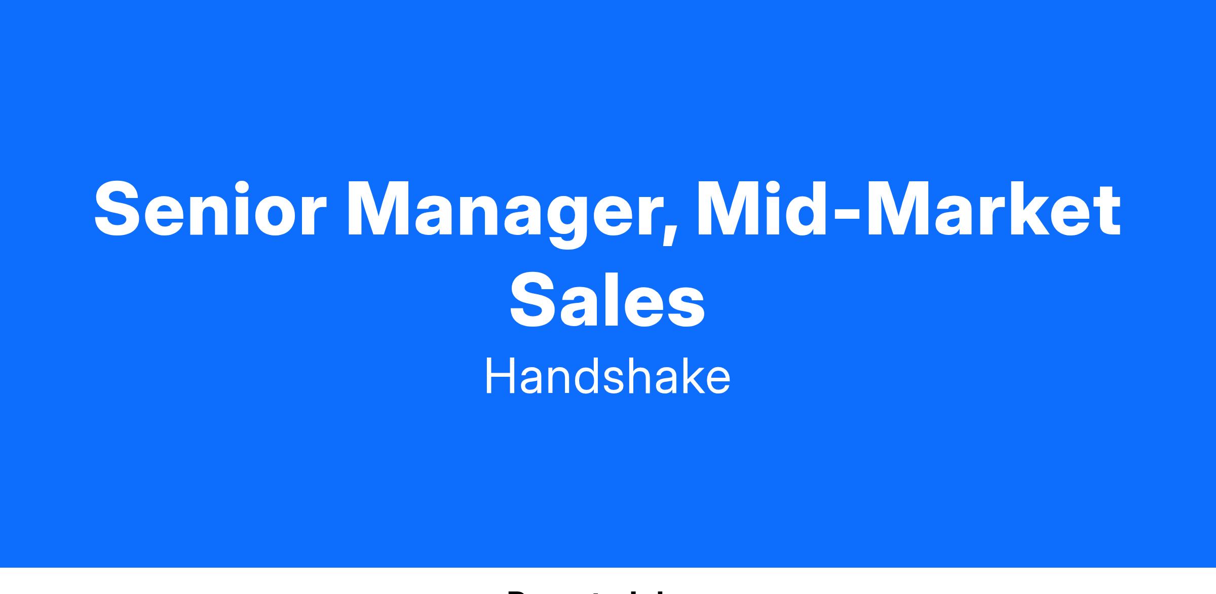 Handshake is hiring a Senior Manager of Mid-Market Sales reporting to the VP of Commercial Sales on the Employer Team. This individual will be responsible for managing a team of people responsible for introducing Handshake’s innovative platform to companies looking to strengthen their early talent strategies, enhance event attendance, improve candidate quality, and elevate brand presence.