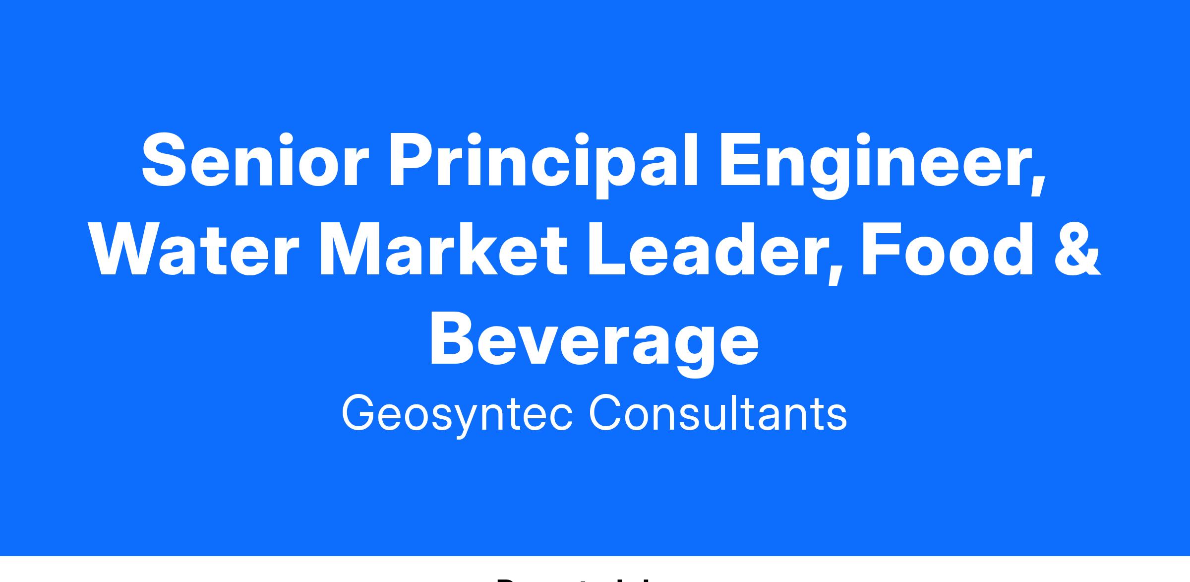 Geosyntec has an exciting opportunity for a Senior Principal Water Market Leader, Food & Beverage to help grow our water and wastewater engineering practices, this individual can be based in one of our Boise, ID, Phoenix, AZ, Pittsburgh, PA, Atlanta, GA, or Acton, MA offices or from any of our other Geosyntec based offices throughout the US. This is a unique opportunity to be part of a leadership team actively engaged in growing the water business at Geosyntec. This position will be responsible for developing and implementing a strategy for achieving significant market share for Geosyntec in the Water for the Food and Beverage market area. work with leading experts with numerous business and professional contacts who are currently developing new process engineering opportunities. The position will also support business growth associated with complex drinking water and industrial wastewater projects across the country, including positioning for and expanding capabilities for delivering full-service projects. This position is well-suited for a talented, experienced individual who is interested in winning and leading innovative and challenging water and wastewater projects, and in working with a dedicated team of peers to transform a business.