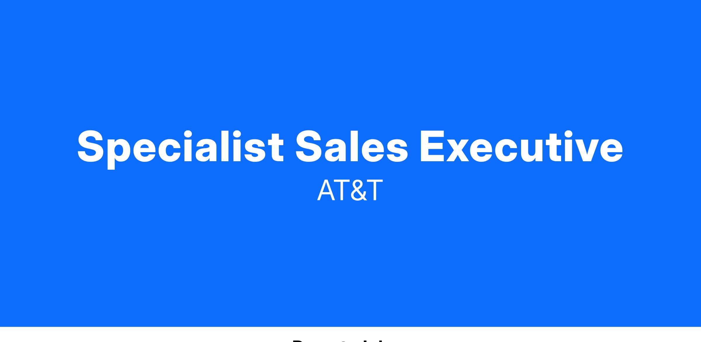 Our Specialist Sales Executives, earn a base salary between $48,300 - $72,500 + commission with a total target compensation of $93,300 - $117,500 if all sales goals are met). Not to mention all the other amazing rewards that working at AT&T offers. From health insurance to tuition reimbursement and paid time off to discounts on products and services just to name a few. There is a lot to be excited about around here. Individual starting salary within this range may depend on geography, experience, expertise, and education/training.