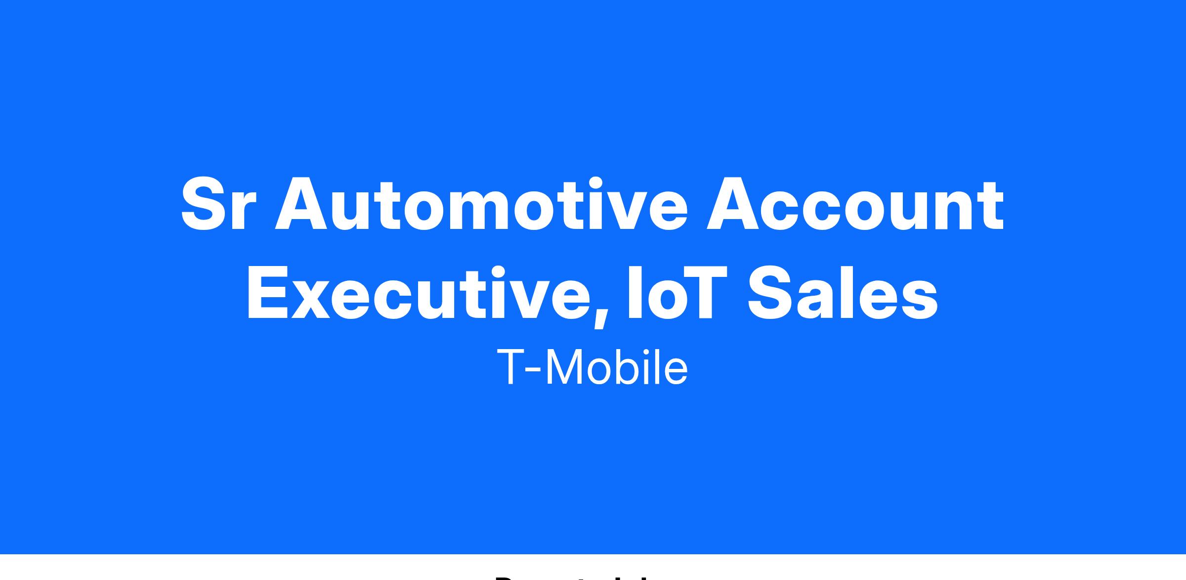 The Senior Automotive IoT Account Executive is a automotive IoT sales professional that actively prospects and cultivates new connected car business relationships that drive IoT revenue for T-Mobile. Responsible for working with automottive companies to implement new connected car initiatives that drive strategic revenue & realize cost savings by using T-Mobile IoT and it's solutioning resources.