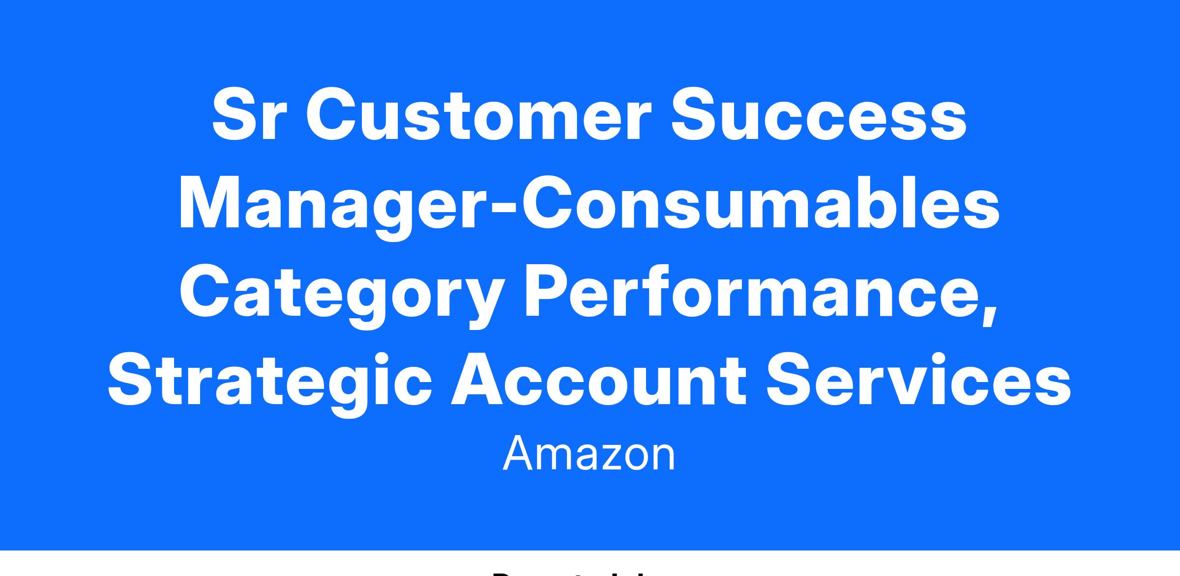 The Strategic Account Services (SAS) organization is seeking a Senior Customer Success Manager to shape the future of our 3rd party marketplace. This role will own end to end seller businesses within the Consumables category, and offers a unique opportunity to drive large scale, high visibility strategic projects across a variety of internal teams.