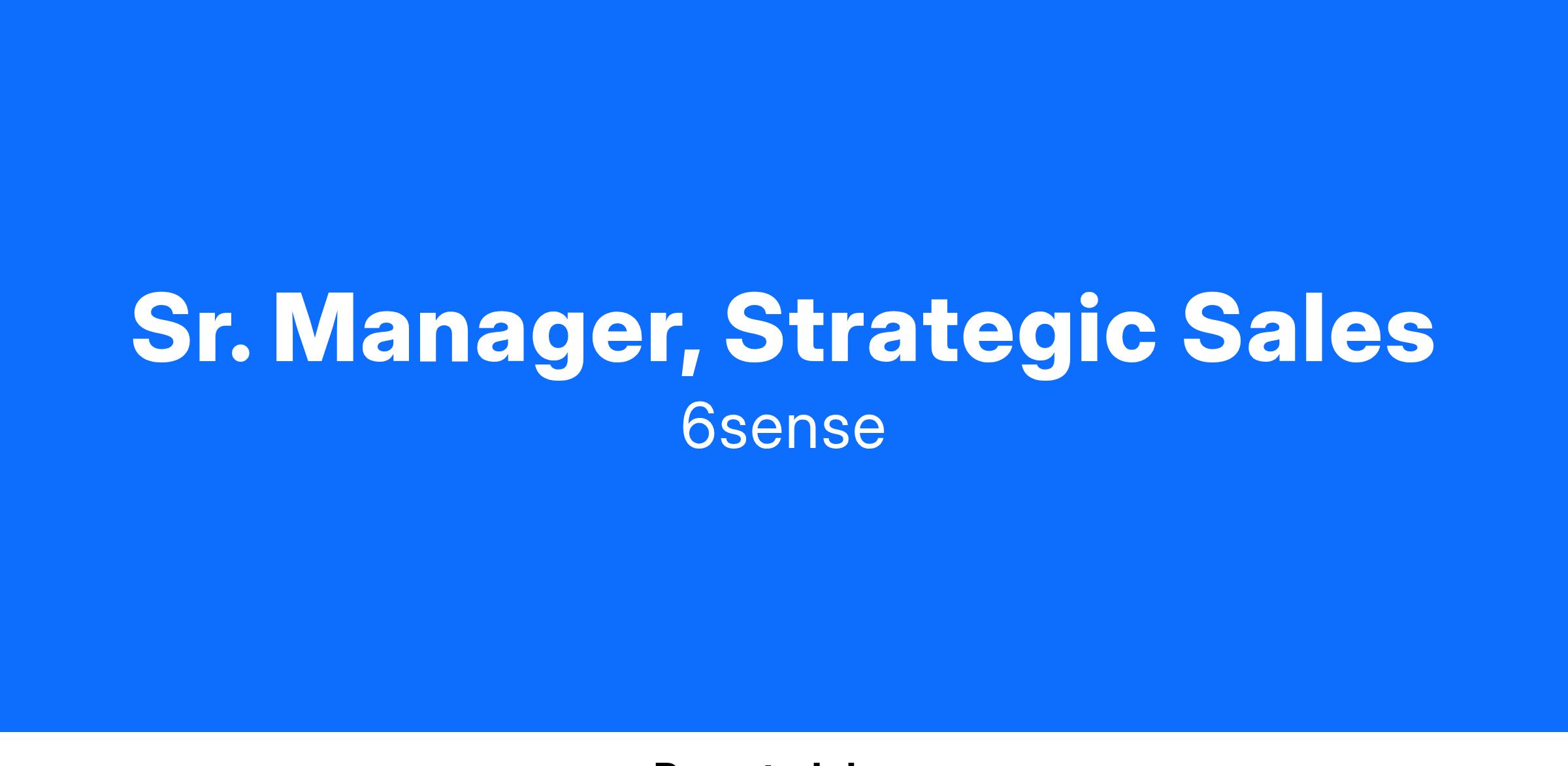 The Sr. Manager, Strategic Sales will build and scale a market leading strategic sales organization. Reporting into the VP, Enterprise + Strategic Sales, this leader will build and lead a high performing sales team through recruiting, coaching, developing and motivating the strategic sales organization to overachieve revenue targets.