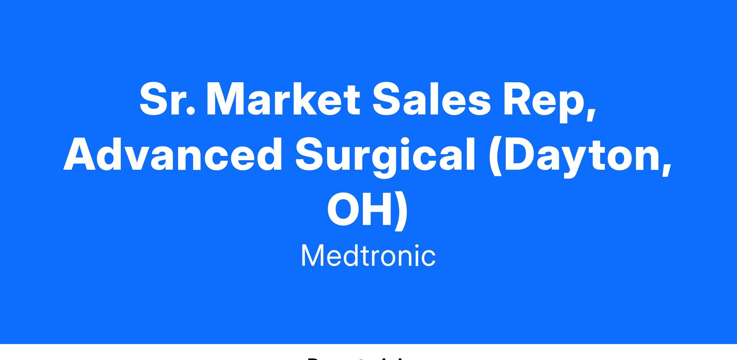 A Sr. Market Sales Representative is expected to achieve annual sales objectives through selling and supporting the Company’s advanced surgical and energy-based products, while representing Medtronic to the customer in accordance with Company policies and AdvaMed guidelines. Sr Market Sales Representatives develop clinical and administrative relationships in assigned accounts and formulate a "defend" territory strategy, accounting for competitive pressures and local market conditions. Sr. Market Sales Representative is expected to demonstrate High Performance Practices and competencies as they meet and exceed objectives for this role.