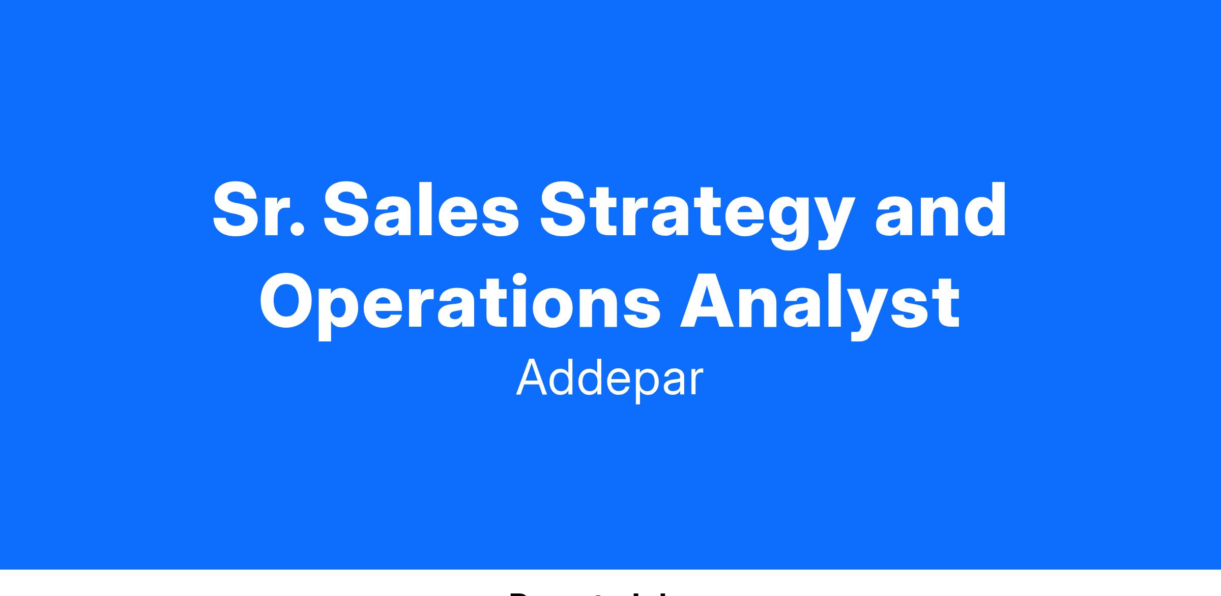Addepar is looking for a dynamic Sales Strategy & Operations Senior Analyst to help support Addepar’s fast-growing sales team. This role is a hybrid of traditional jobs in business analytics, sales operations, and finance – requiring a mix of go-to-market design, market analysis, sales optimization, strategy, and business operational support. Join our dynamic and forward-thinking team to make a significant impact on our revenue growth journey!