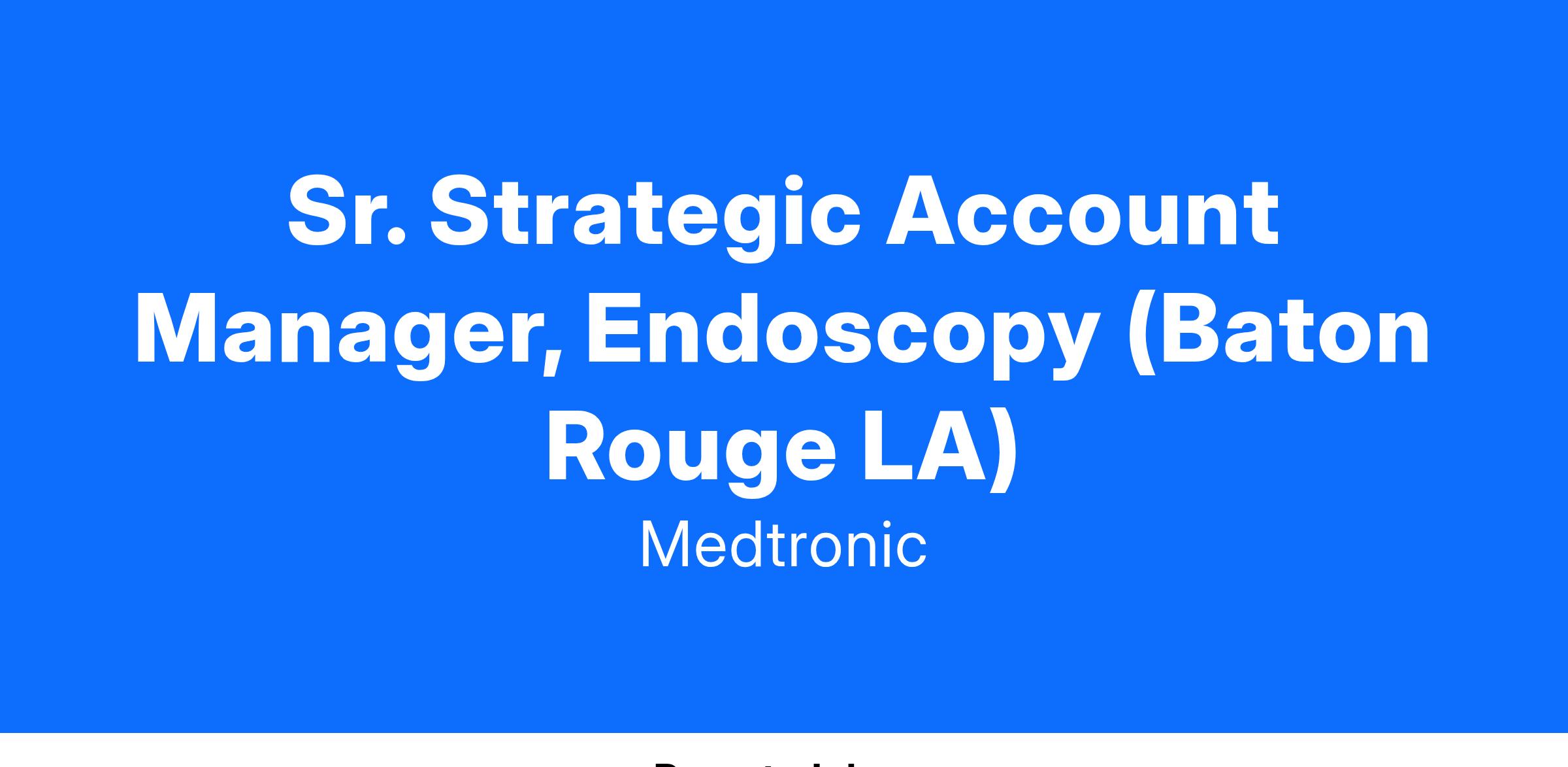The Sr. Strategic Account Manager (SAM) is a field-based Medtronic Gastrointestinal sales position. This individual will call on healthcare organizations, primarily hospitals, in a defined geographic area. The Sr. SAM will serve as a customer facing product expert primarily responsible educating physicians and nurses on the clinical advantages of the entire GI product portfolio. The position is focused on expanding the utilization of GI products through market development and sales-oriented activities. Additionally, the Sr. SAM is required to continually develop their clinical knowledge to serve as a product expert for the company. By doing so, they can convey information in an effective manner to help support optimal utilization of the full product portfolio to the widest range of health care providers.