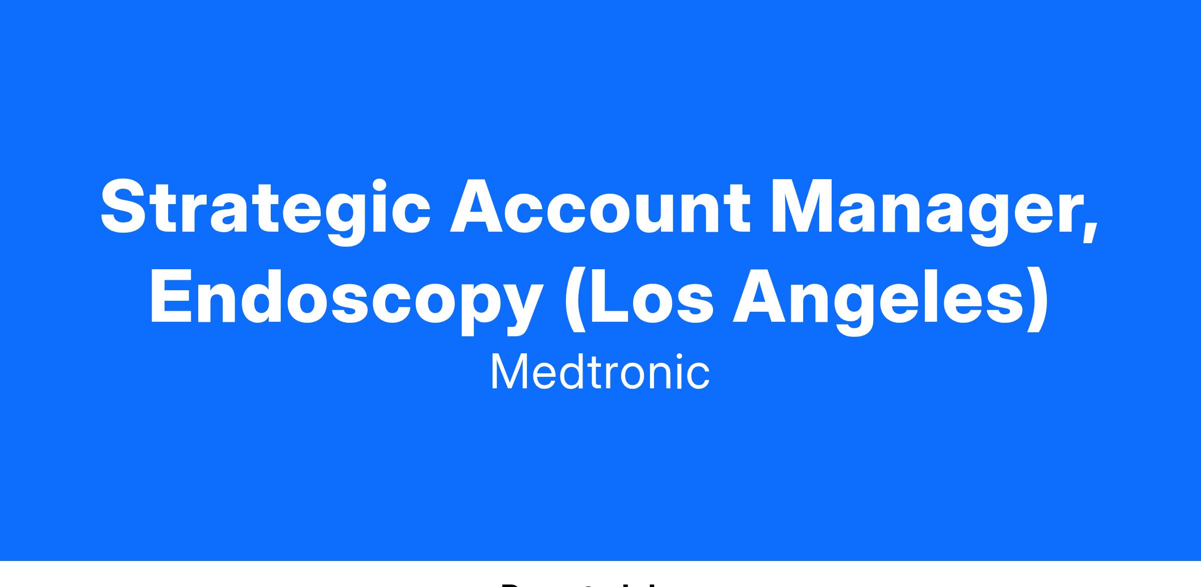 The Strategic Account Manager (SAM) is a field-based Medtronic Gastrointestinal sales position. This individual will call on healthcare organizations, primarily hospitals, in a defined geographic area. The SAM will serve as a customer facing product expert primarily responsible educating physicians and nurses on the clinical advantages of the entire GI product portfolio. The position is focused on expanding the utilization of GI products through market development and sales-oriented activities. Additionally, the SAM is required to continually develop their clinical knowledge to serve as a product expert for the company. By doing so, they can convey information in an effective manner to help support optimal utilization of the full product portfolio to the widest range of health care providers.