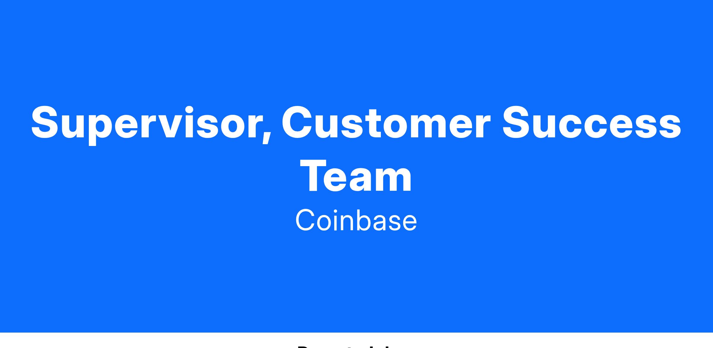 As a Supervisor for the Customer Success Team you will lead a specialized team of customer focussed support analysts who own high value customer relationships that are essential to Coinbase achieving its mission. Using your customer support, operations, and team leadership skills you will play a crucial role ensuring we deliver an outstanding high value customer experience globally.