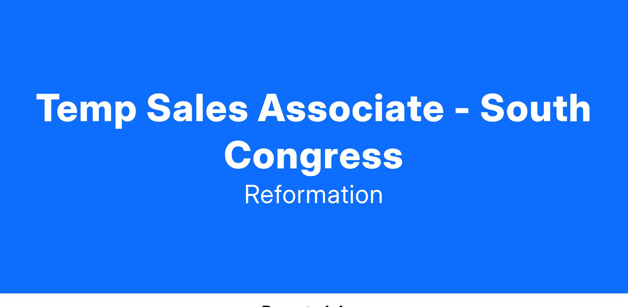 No position at Reformation is about the status quo, every team member is passionate about building a company rooted in excellence. Obsessed with customers and sustainability we use tech to create a unique interaction between our customers, employees, and the Reformation brand. The Associate will execute all efforts required to achieve individual sales goals.