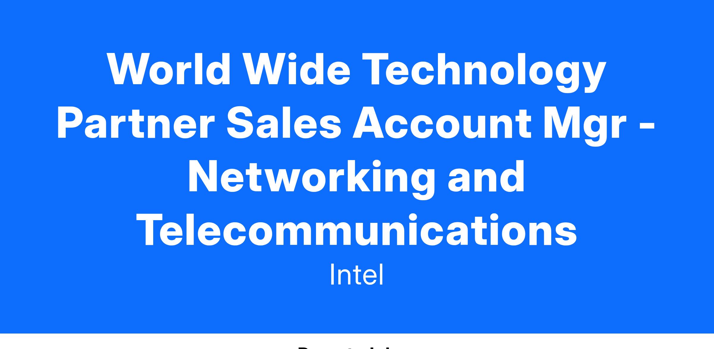 In this role, you will work with one of Intel's largest national solution provider partners, World Wide Technology (WWT) to drive sell in and/or sell through activities focused primarily on the networking and edge product portfolio across telecommunications and other relevant industries, such as content service providers, manufacturing and media/entertainment.